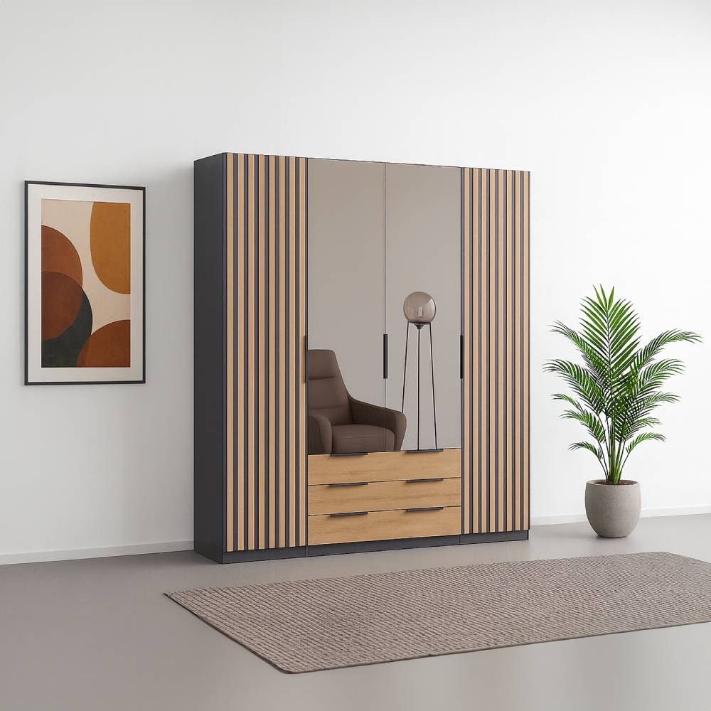 ארון בקווים נקיים המשלב טקסטורת עץ חמה עם חזית חלקה וזכוכית שקופה או מושחרת.