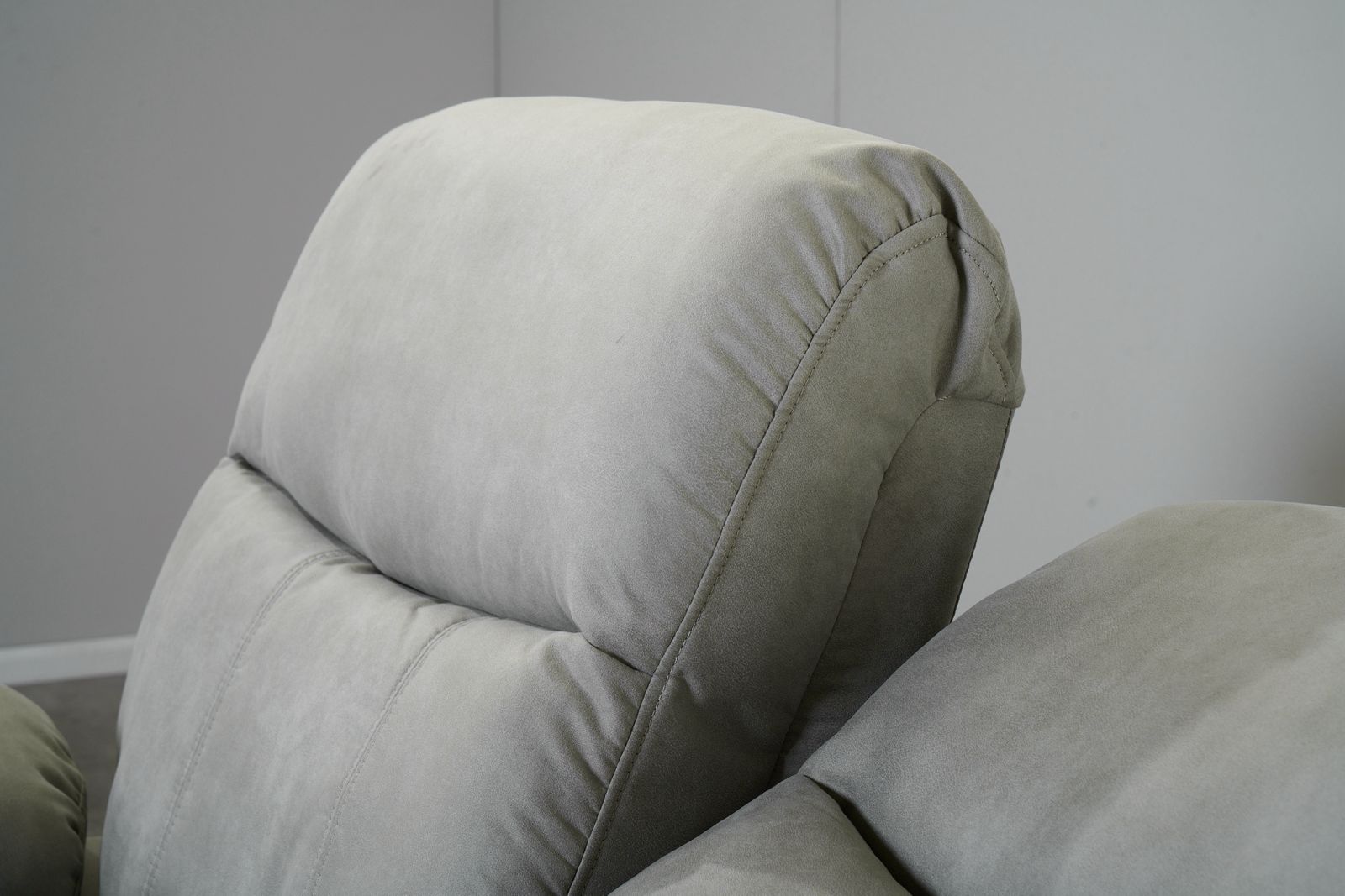 מערכת ישיבה 3+2 עם ריקליינרים דגם אמברוס בבד אפור בהיר מעוצבת בסגנון מודרני עכשווי בעלת קווים ישרים ומינימליסטיים.