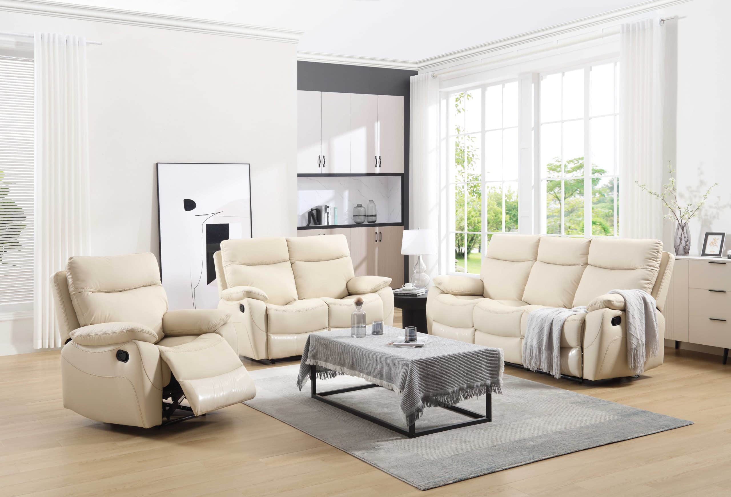 מערכת ישיבה עם ריקליינרים 3+2+1 דגם פיטארו בדמוי עור בז'