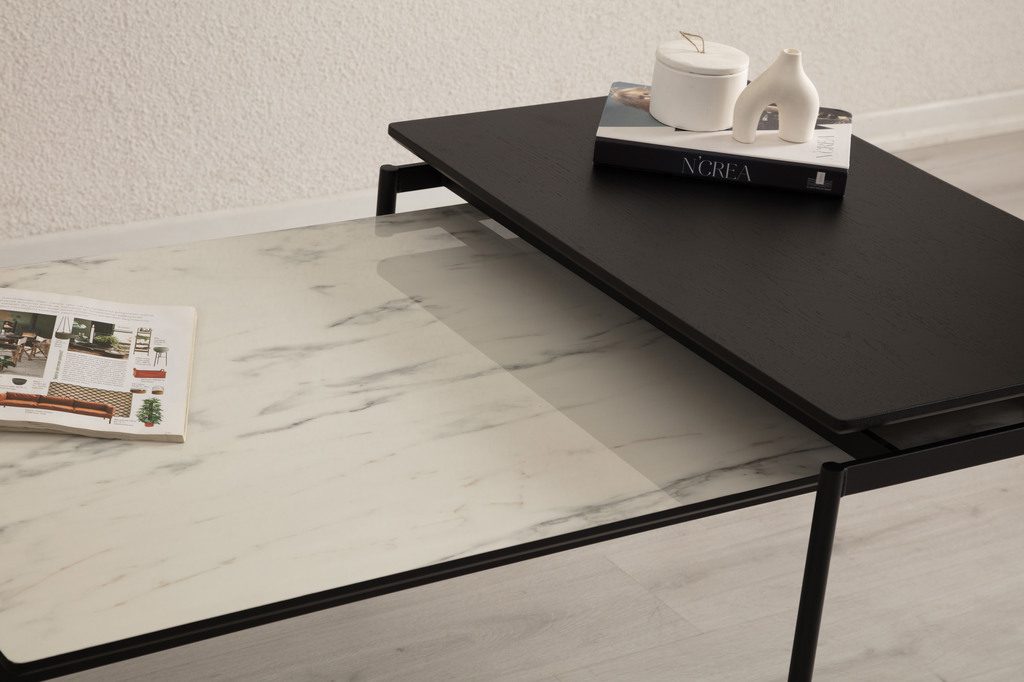 דגם מונקו הוא שולחן העשוי מMDF בגימור דמוי שיש לבן מבריק בשילוב שחור ברמה הגבוהה ביותר עם רגלי מתכת שחורות.