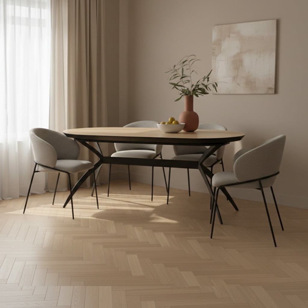 שולחן האוכל עשוי MDF בציפוי למינציה דמוי עץ טבעי, ורגלי השולחן עשויים ממתכת עם גימור צביעה אלקטרוסטטי נגד חלודה בצבע שחור.