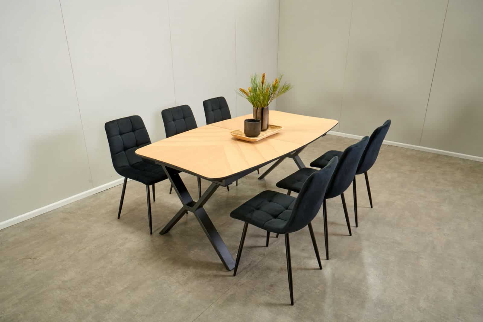 פינת האוכל כוללת שולחן המעוצב בקו איטלקי עדין, המשלב בין חומרים של מתכת שחורה אלגנטית ודמוי שיש שחור המקנה לחלקי המתכת מראה אלגנטי ומונעת אפשרות של חלודה.