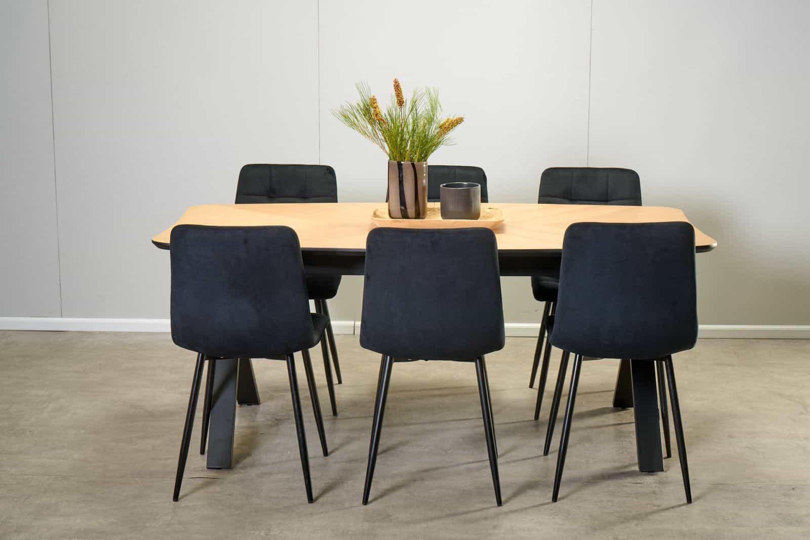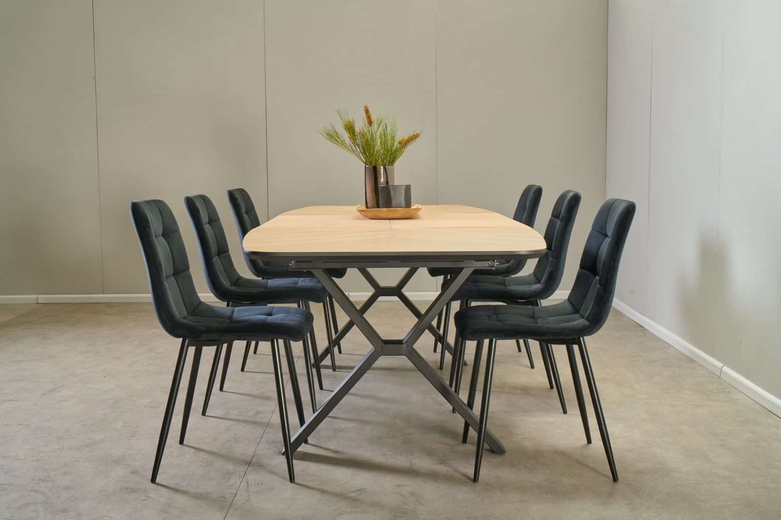 המערכת כוללת 6 כסאות דגם סנדרין חזקים ונוחים במיוחד המשתלבים במערכת האוכל בצורה מושלמת הכסאות מרופדים בבד קטיפתי 100% סינתטי.