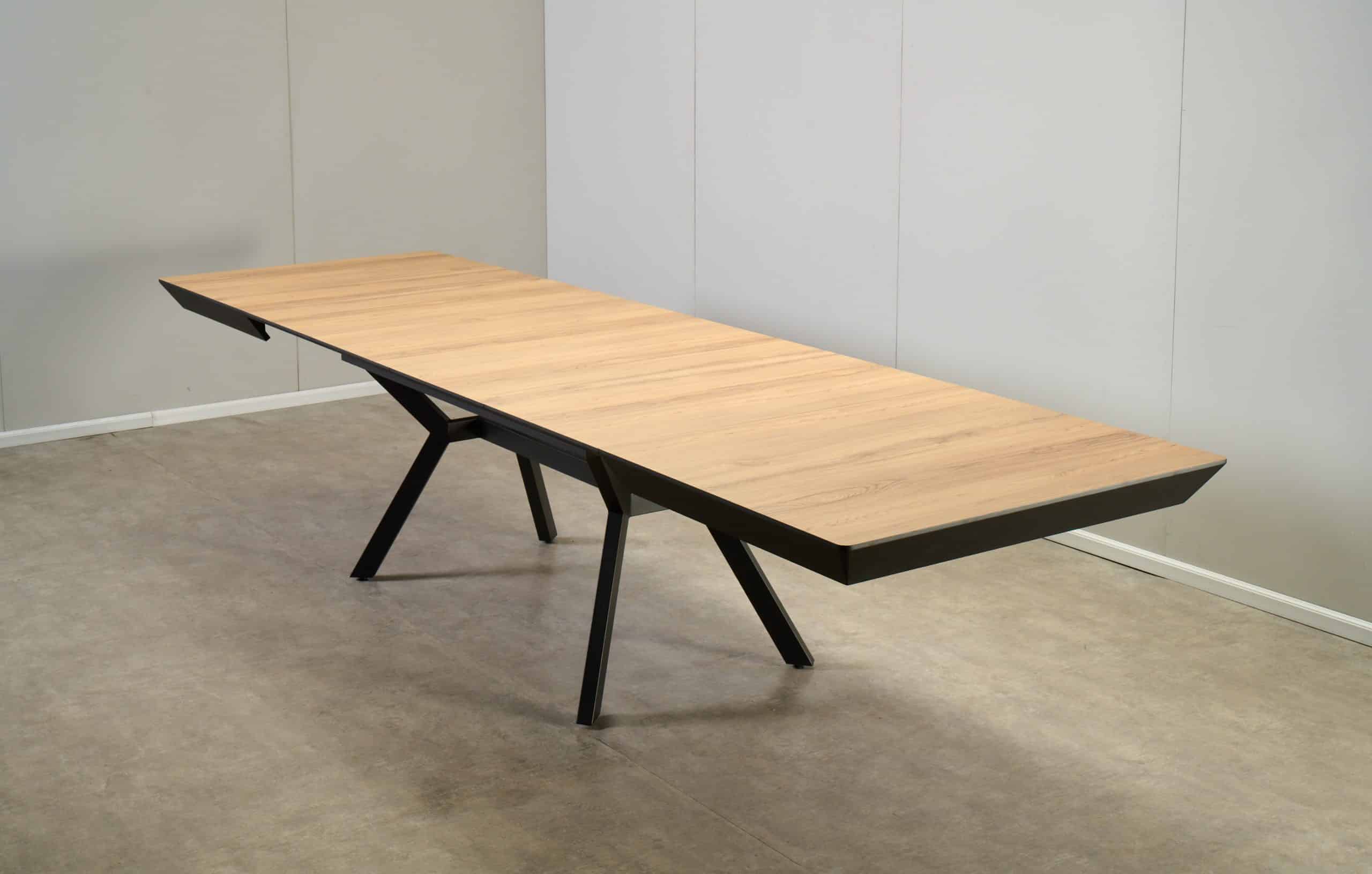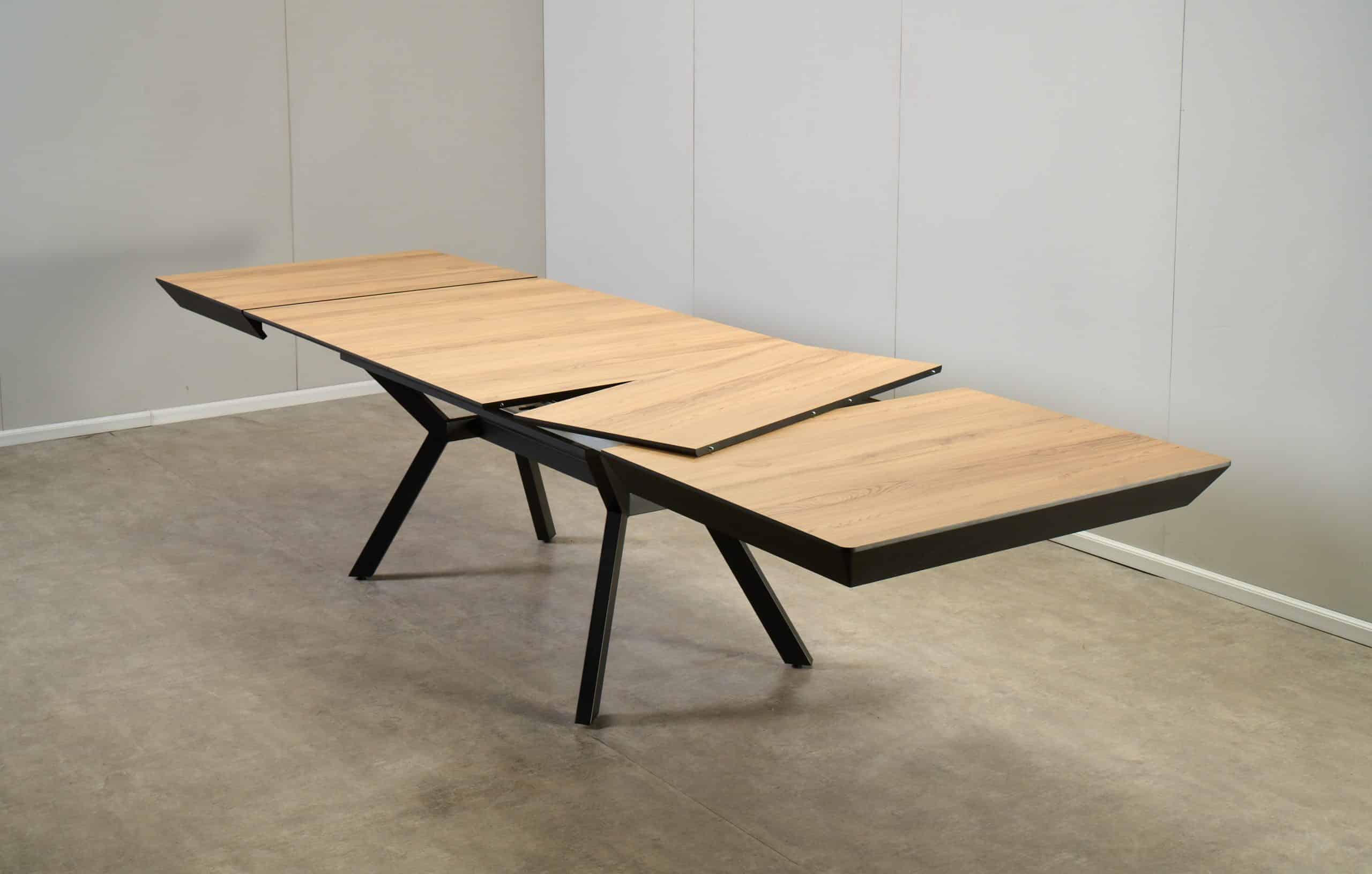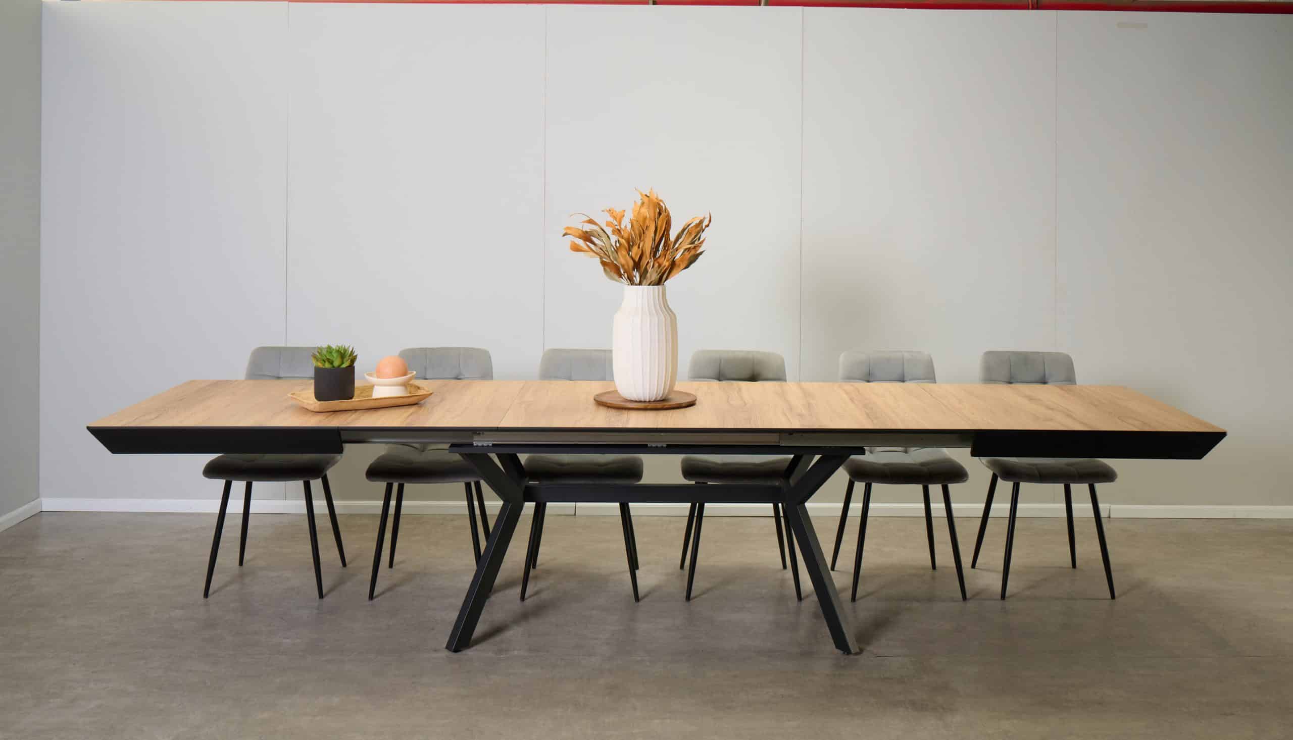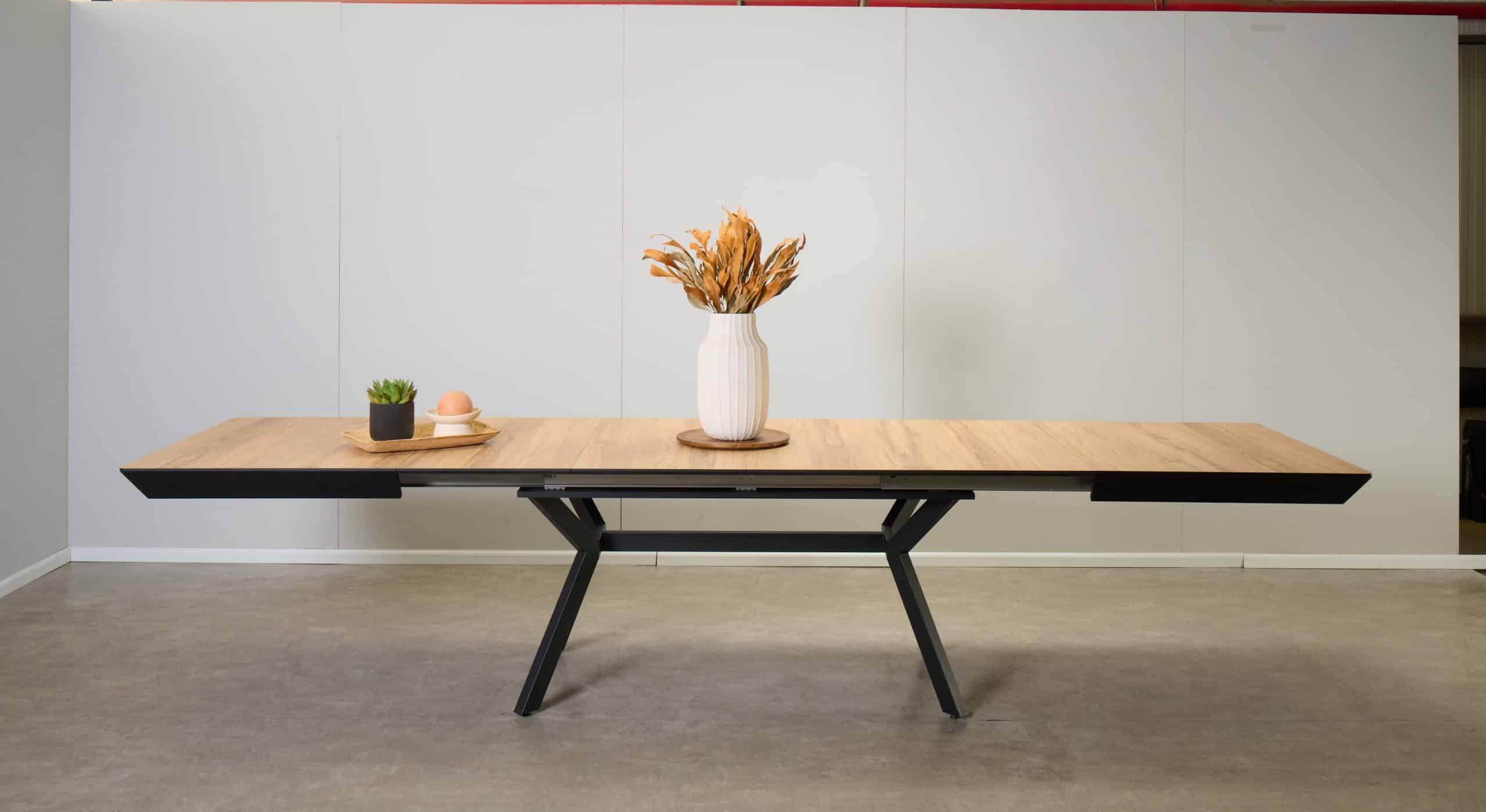 השולחן באורך 1.60 מ’ ובעל 4 הארכות של 50 ס”מ נוספים ואורך מלא של 3.60 מ’.