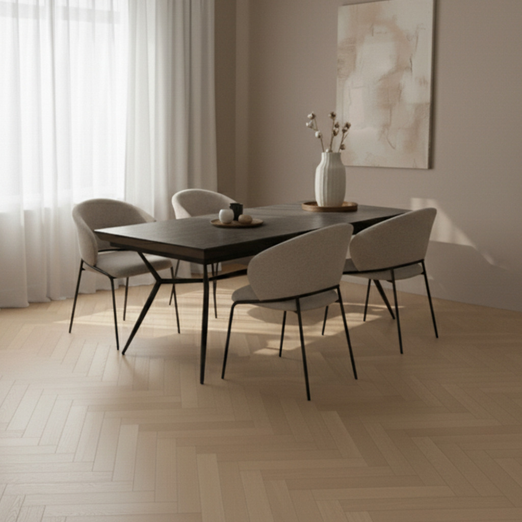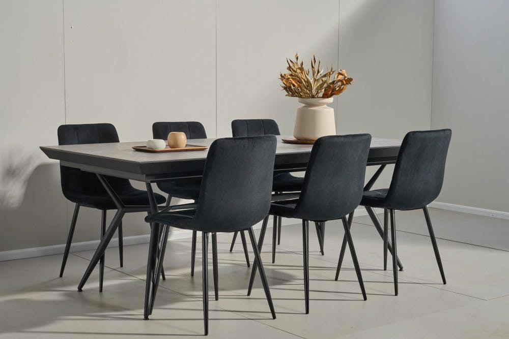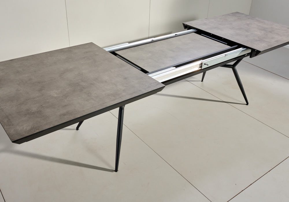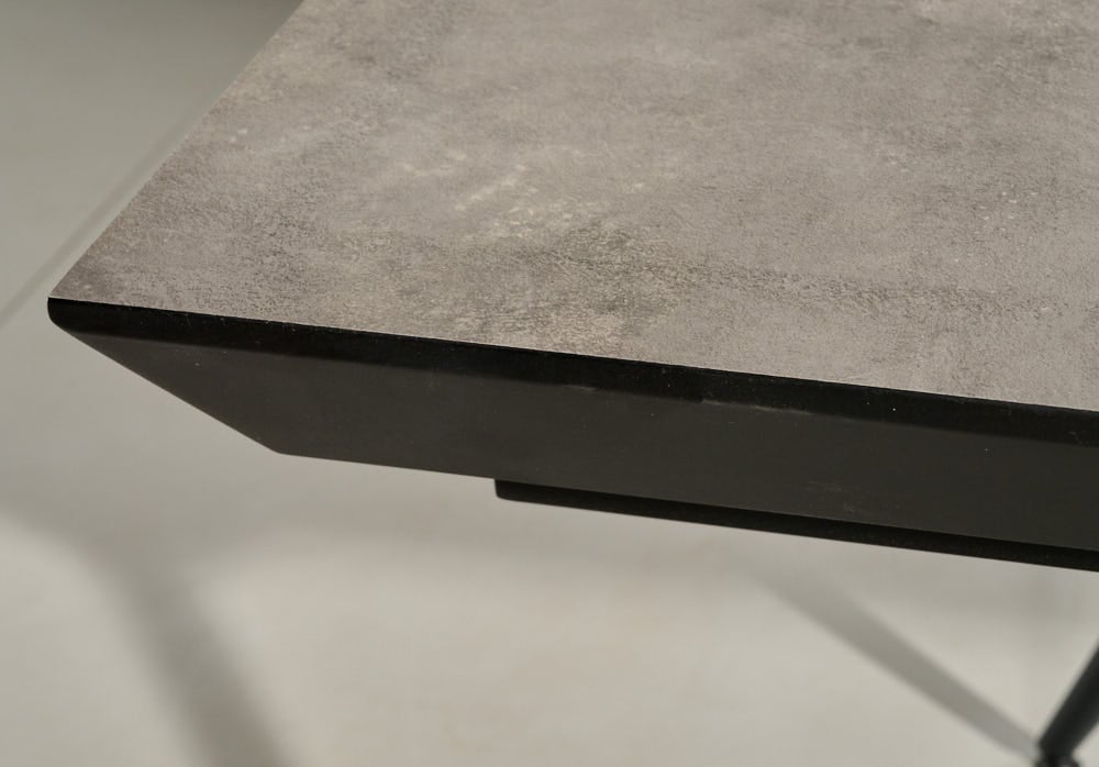 שולחן האוכל עשוי MDF בציפוי למינציה דמוי בטון, ורגלי השולחן עשויים ממתכת עם גימור צביעה אלקטרוסטטי נגד חלודה בצבע שחור.