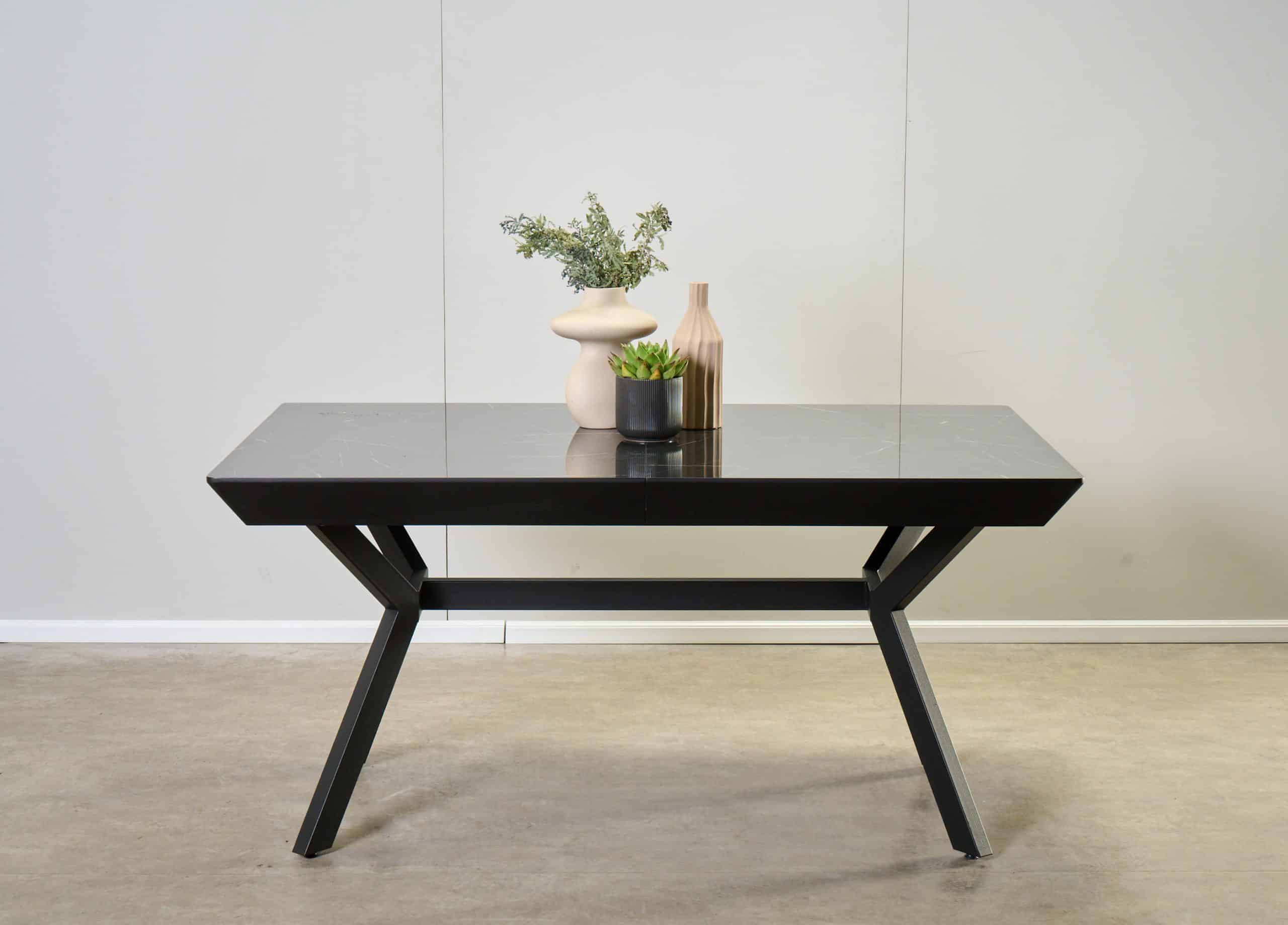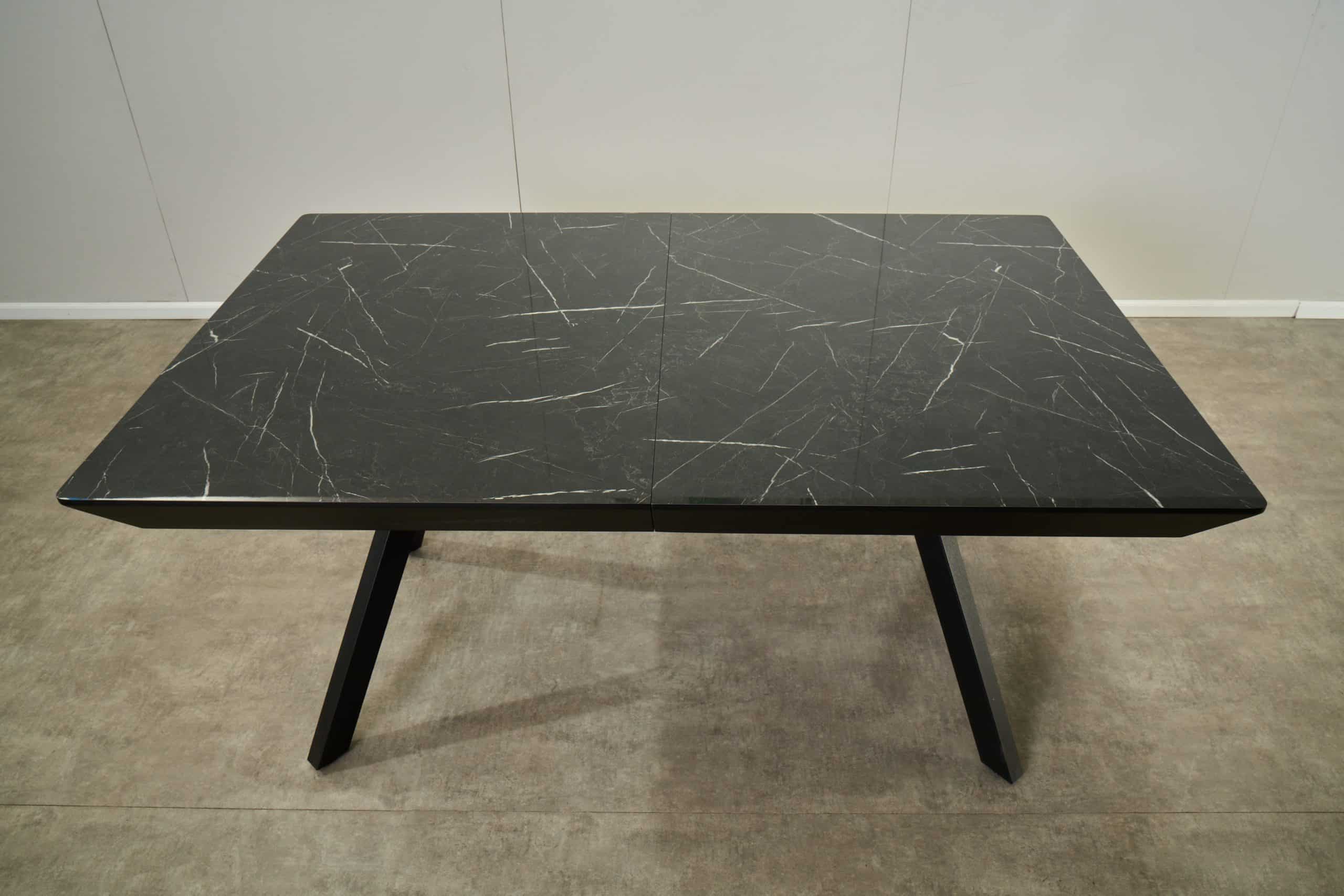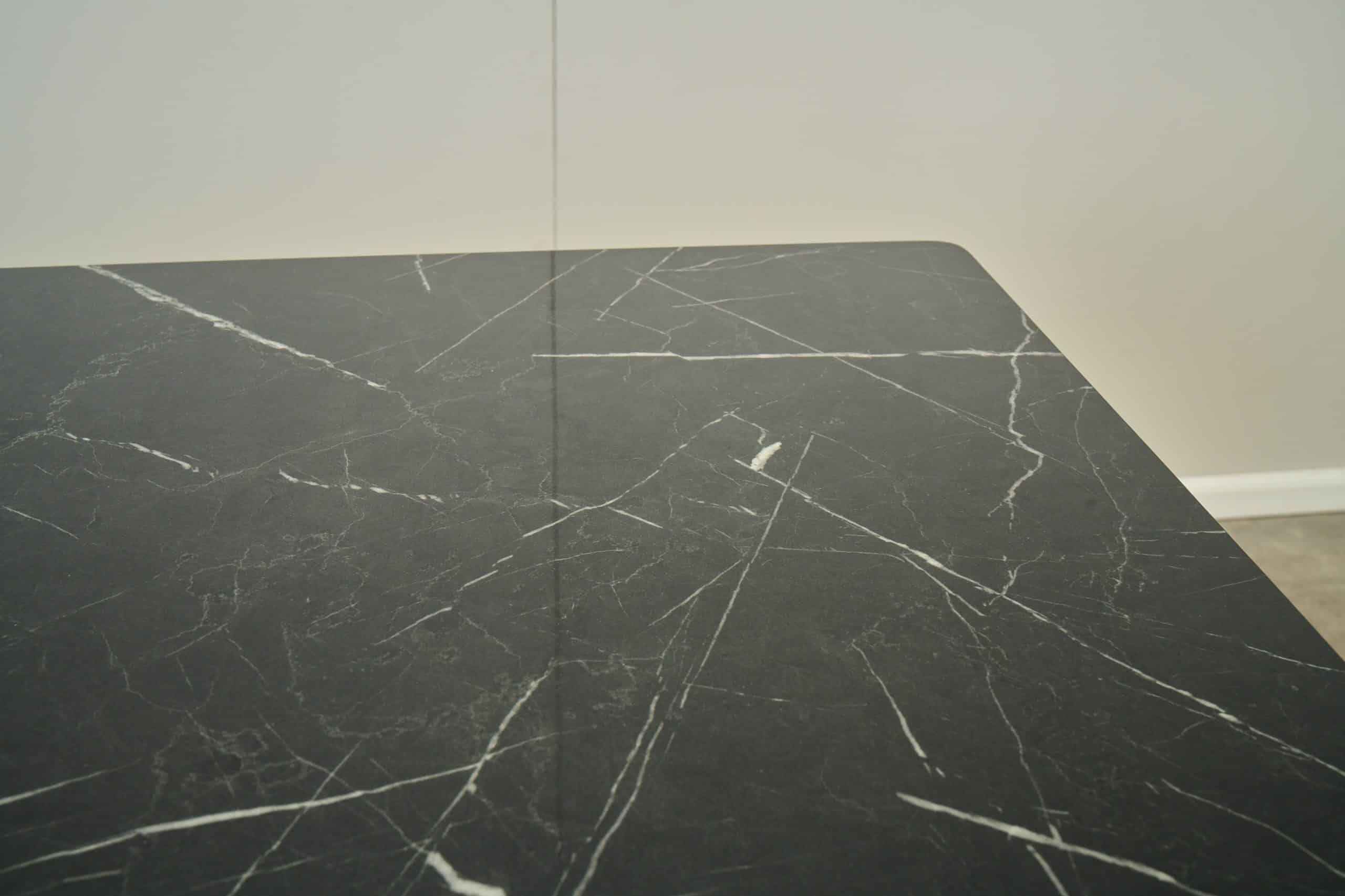 שולחן האוכל עשוי MDF בציפוי למינציה דמוי שיש שחור מבריק , ורגלי השולחן עשויים ממתכת עם גימור צביעה אלקטרוסטטי נגד חלודה בצבע שחור.