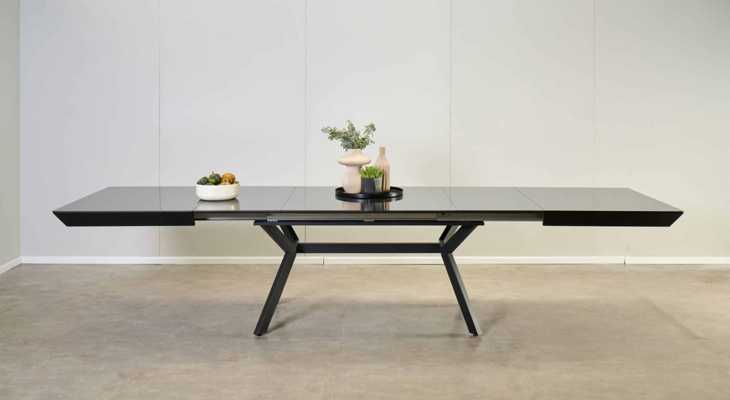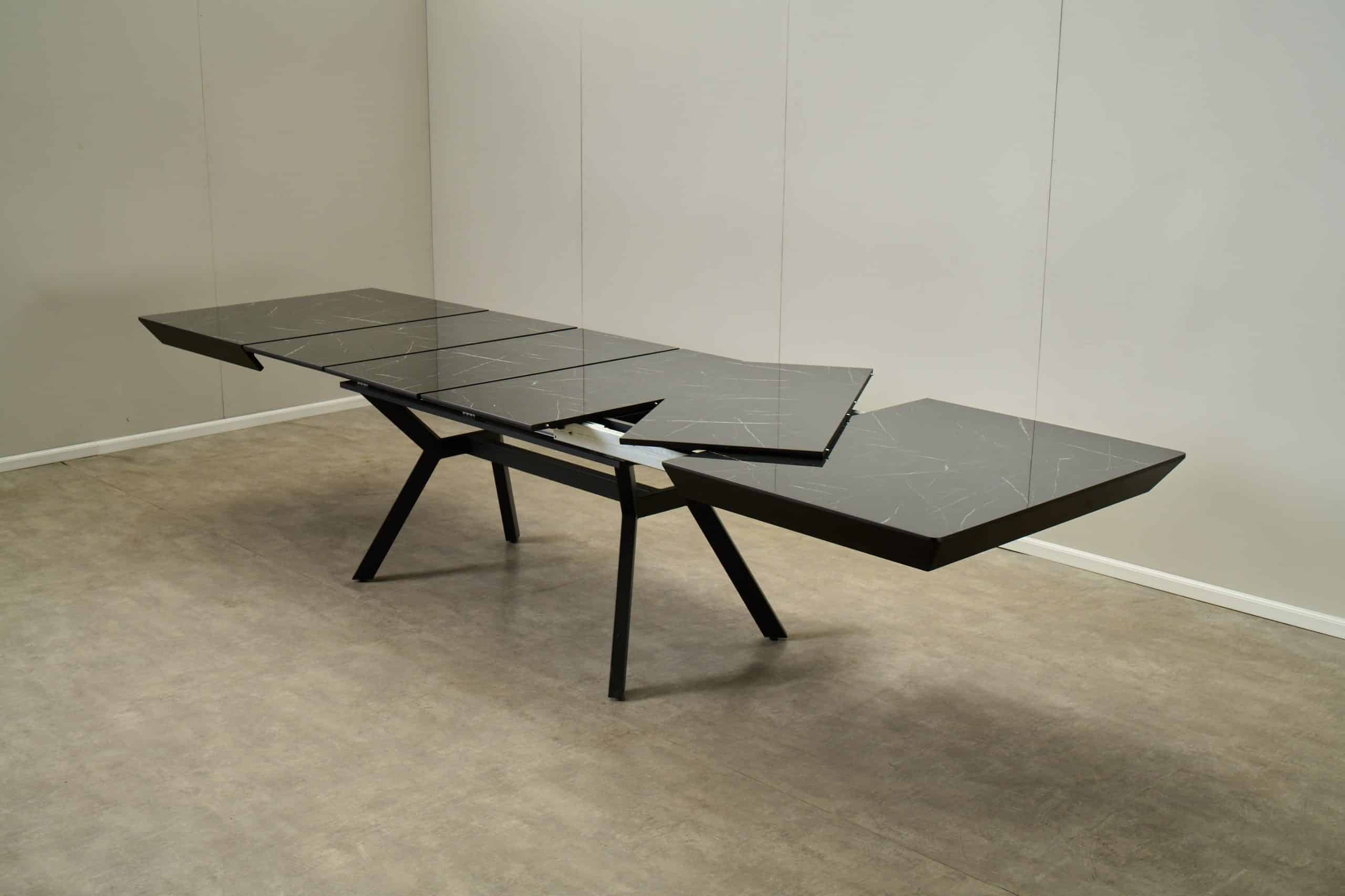 השולחן באורך 1.60 מ’ ובעל 4 הארכות של 50 ס”מ נוספים ואורך מלא של 3.60 מ’.