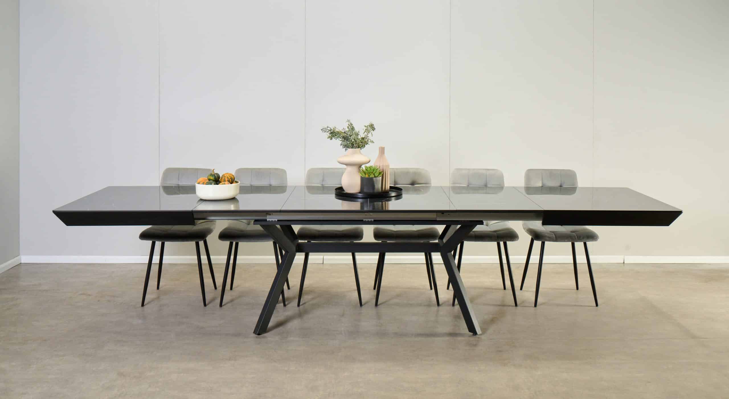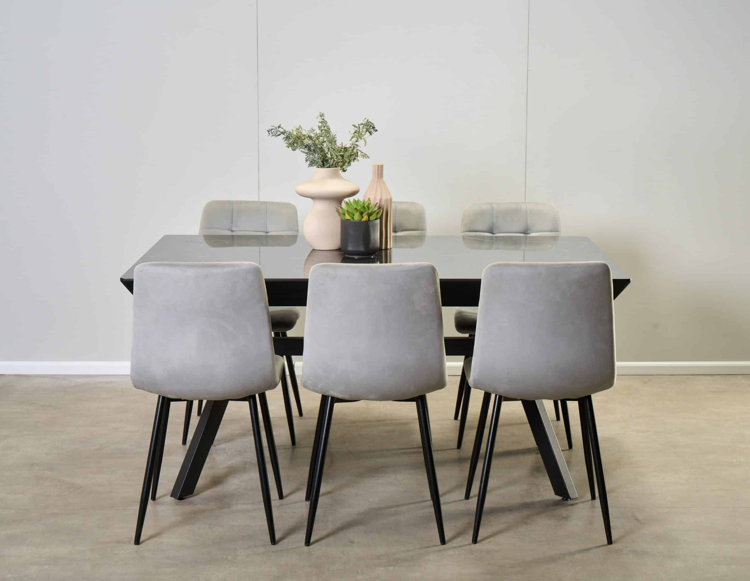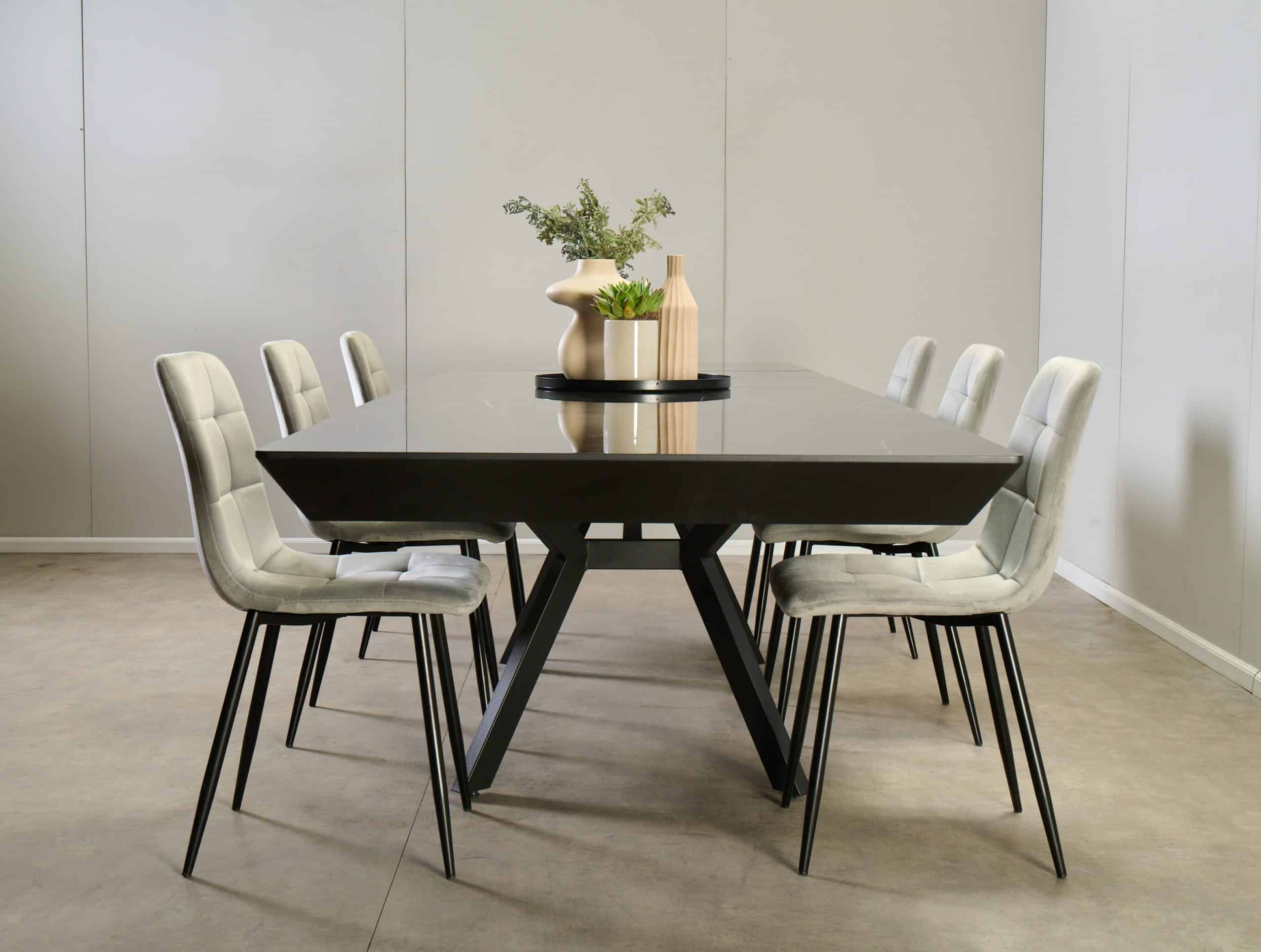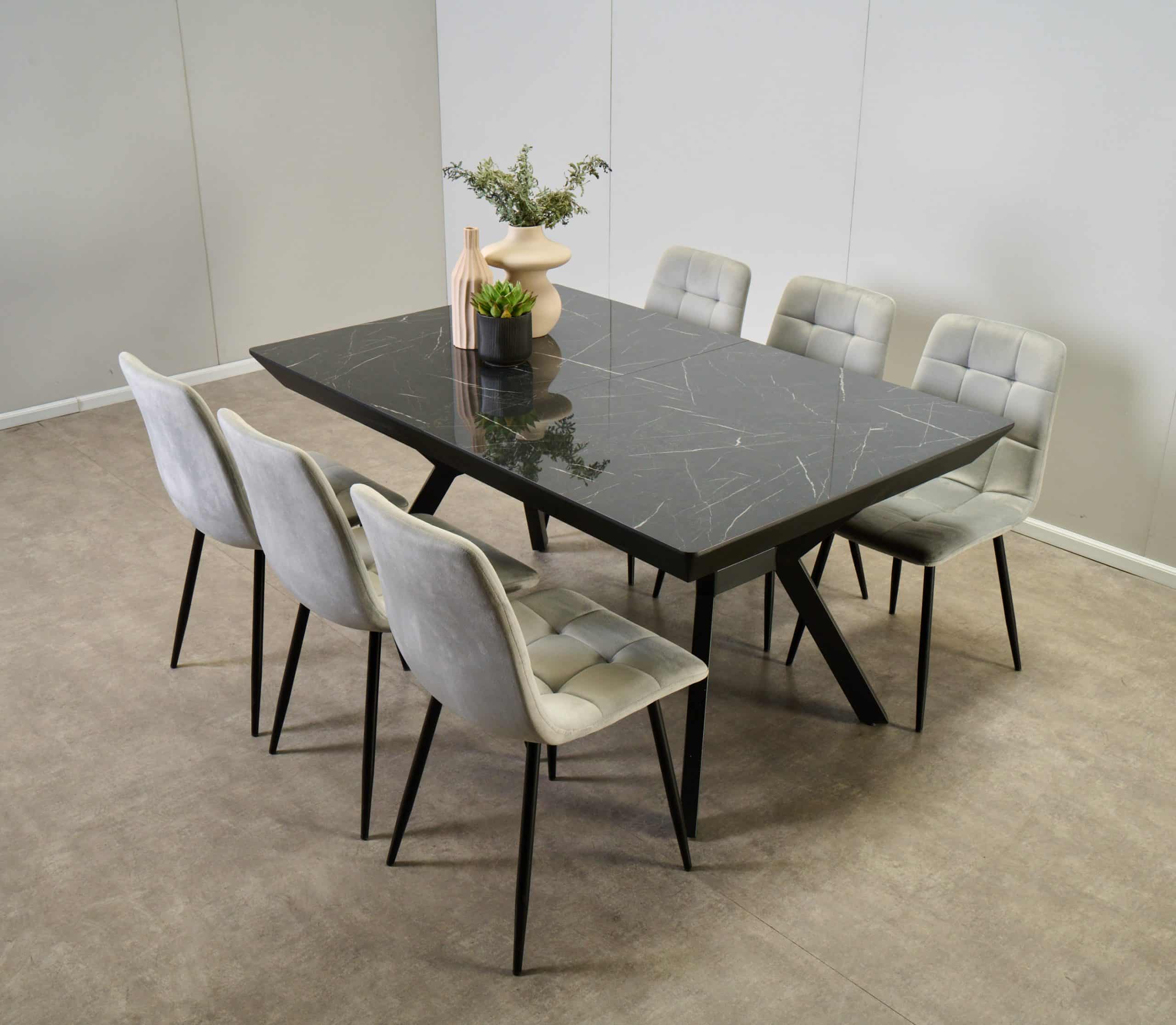פינת אוכל מלבנית דמוי שיש שחור מבריק דגם רוגן + 6 כסאות – 16 סועדים