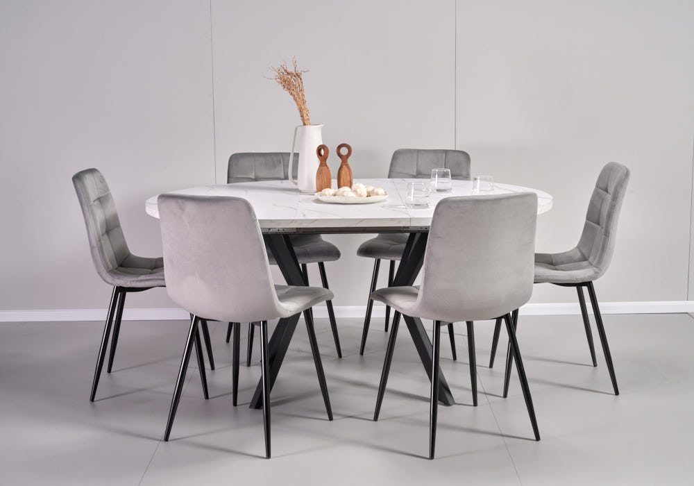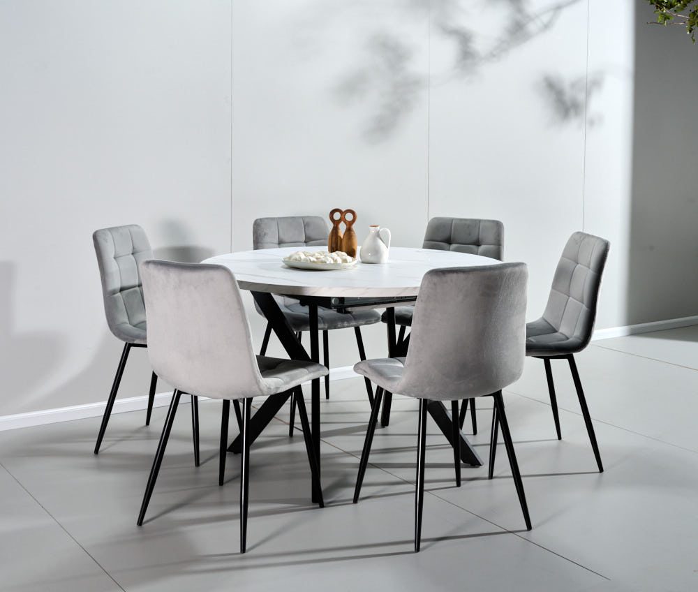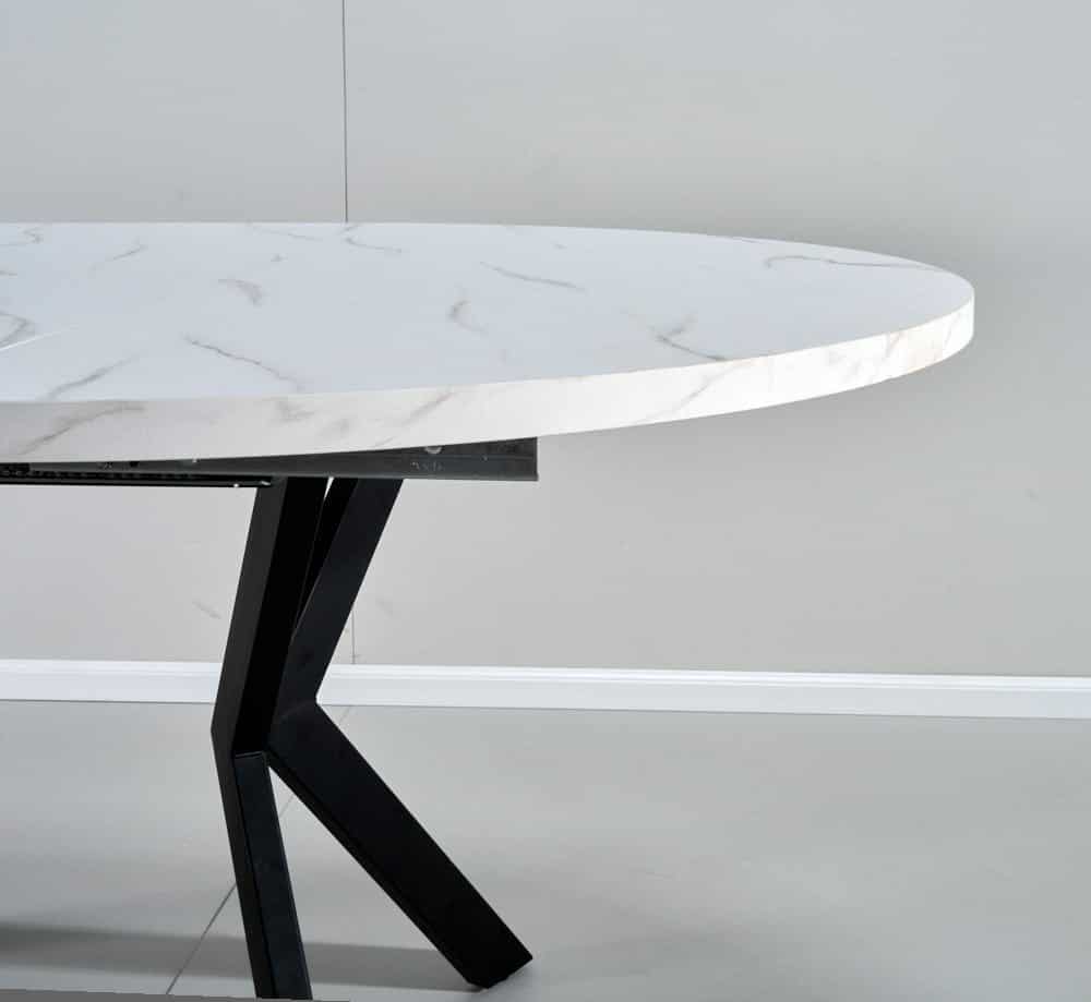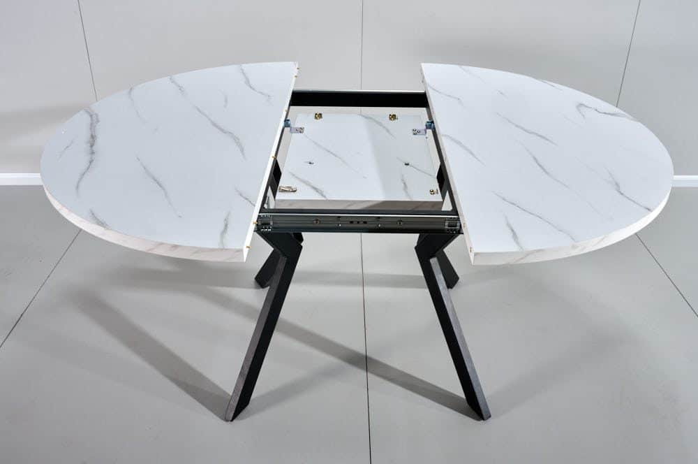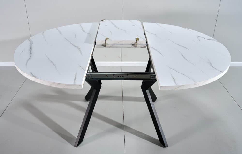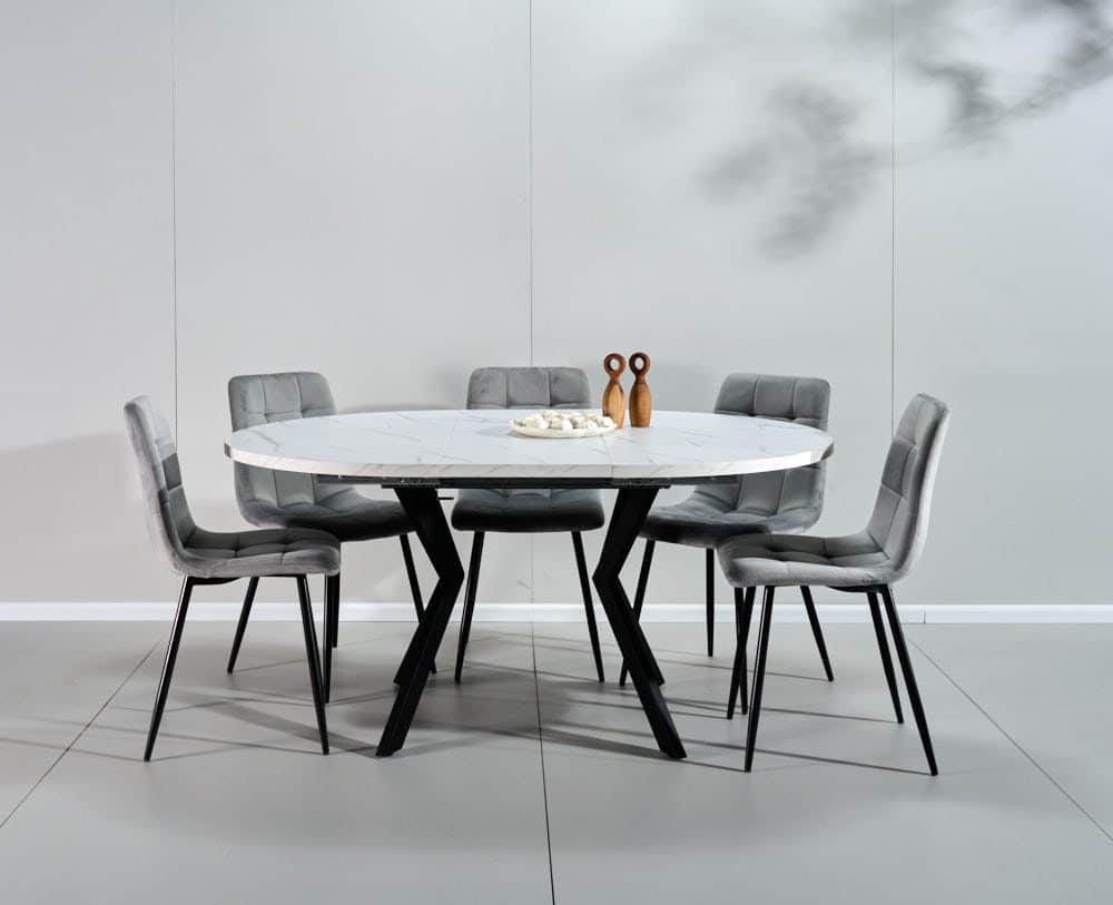 פינת אוכל עגולה נפתחת דמוי שיש לבן דגם אלמוס + 6 כסאות – 8 סועדים
