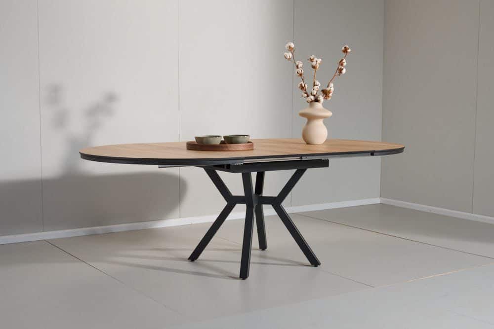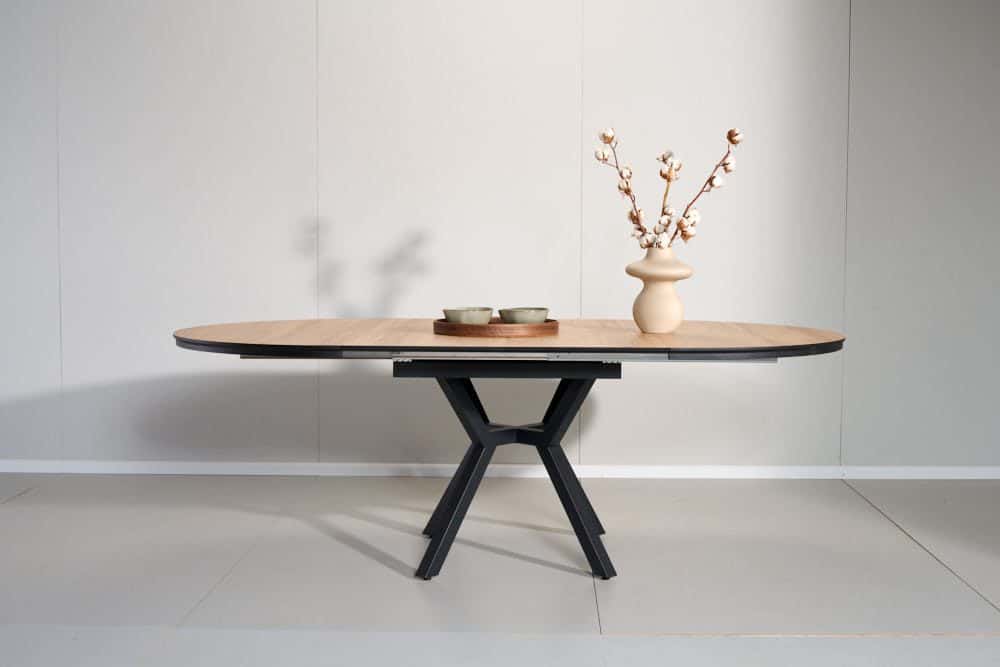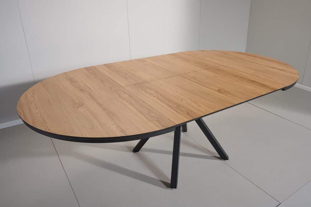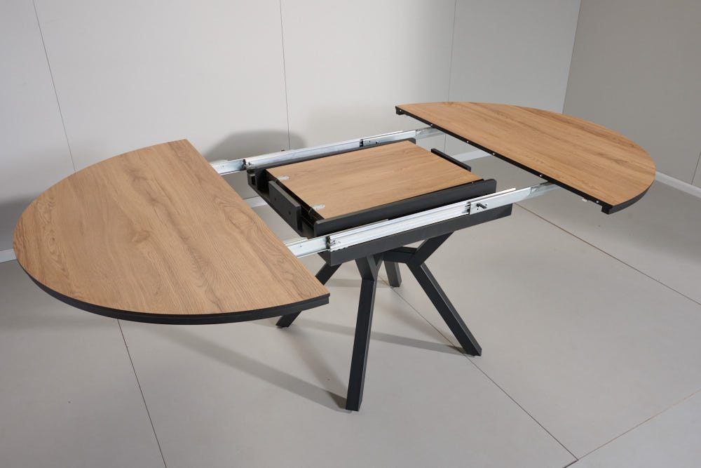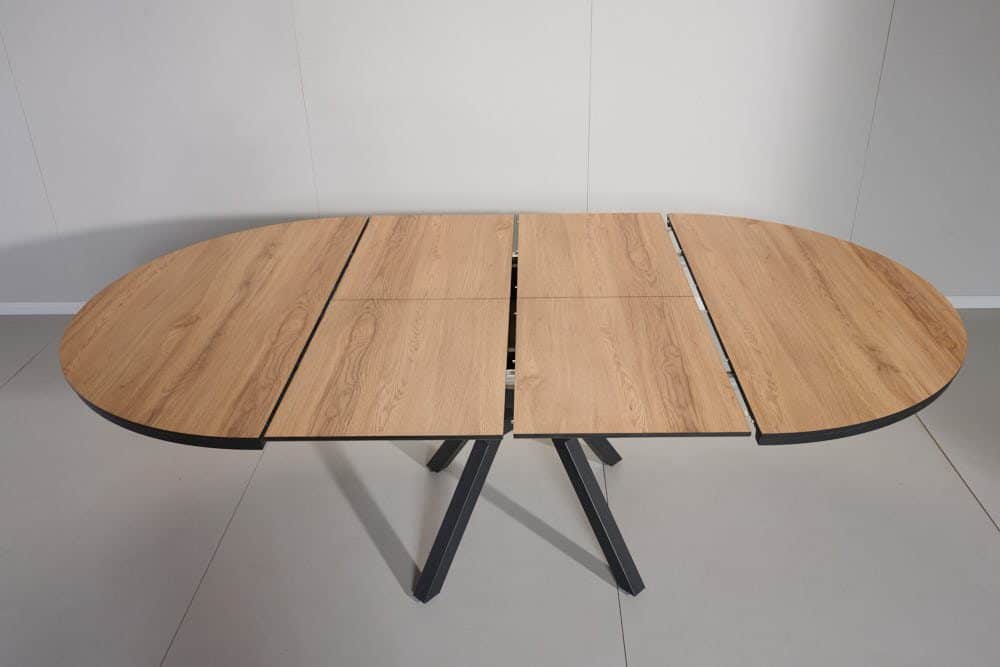 השולחן בקוטר 1.30 מ’ בעל 2 הארכות של 50 ס”מ נוספים וקוטר מלא של 2.36 מ’.