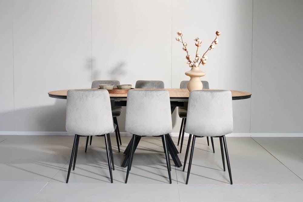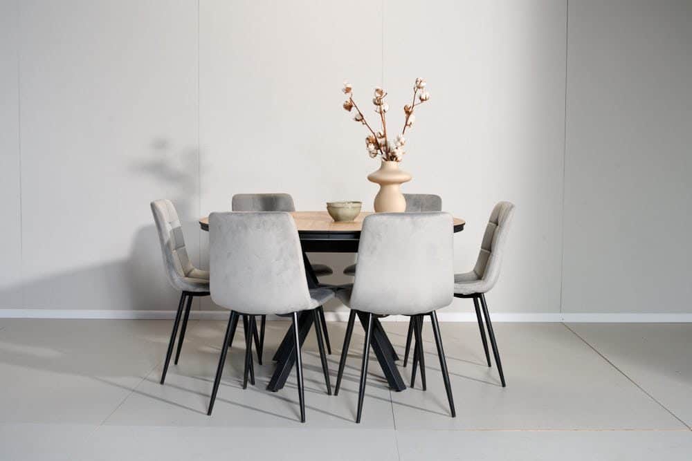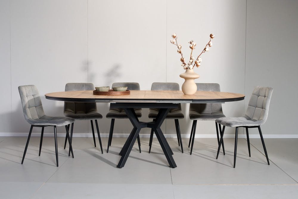 פינת אוכל עגולה נפתחת דמוי עץ טבעי דגם לונגו + 6 כסאות – 10 סועדים