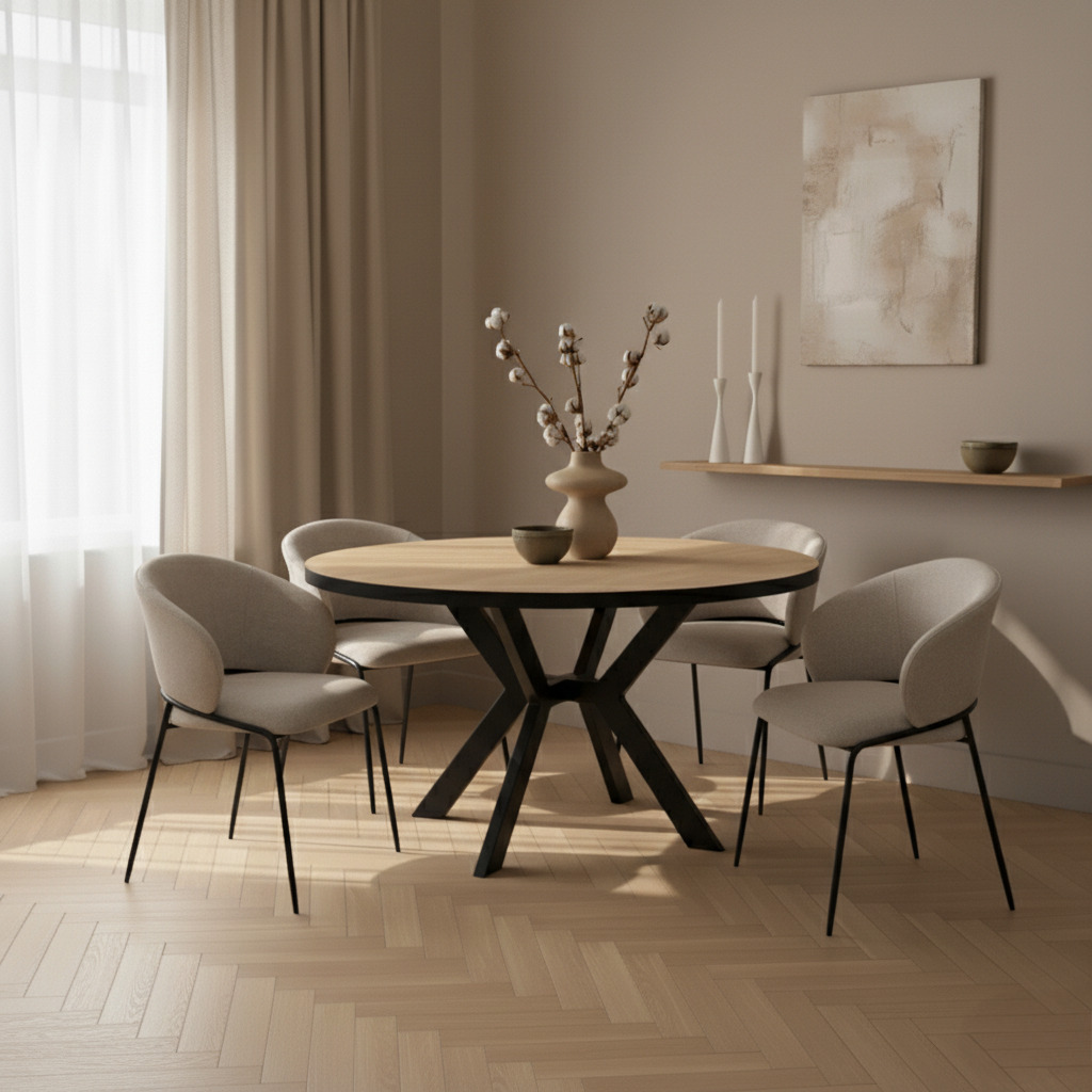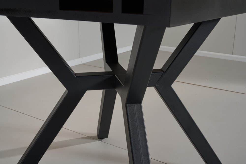שולחן האוכל עשוי MDF בציפוי למינציה דמוי עץ טבעי, ורגלי השולחן עשויים ממתכת עם גימור צביעה אלקטרוסטטי נגד חלודה בצבע שחור.