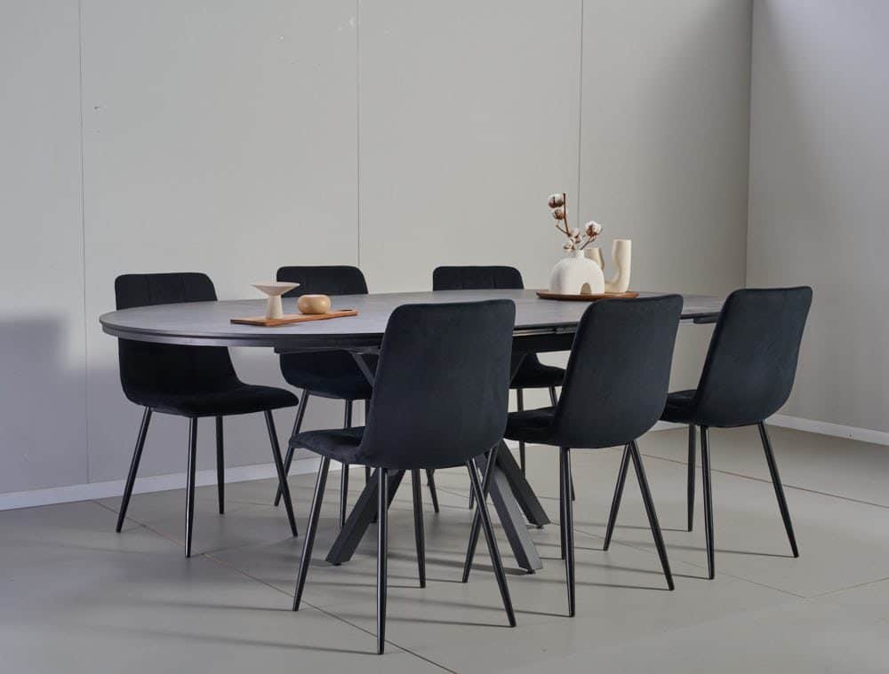 פינת אוכל מלבנית דמוי שיש שחור דגם ספיידר + 6 כסאות דגם סנדרין – 10 סועדים