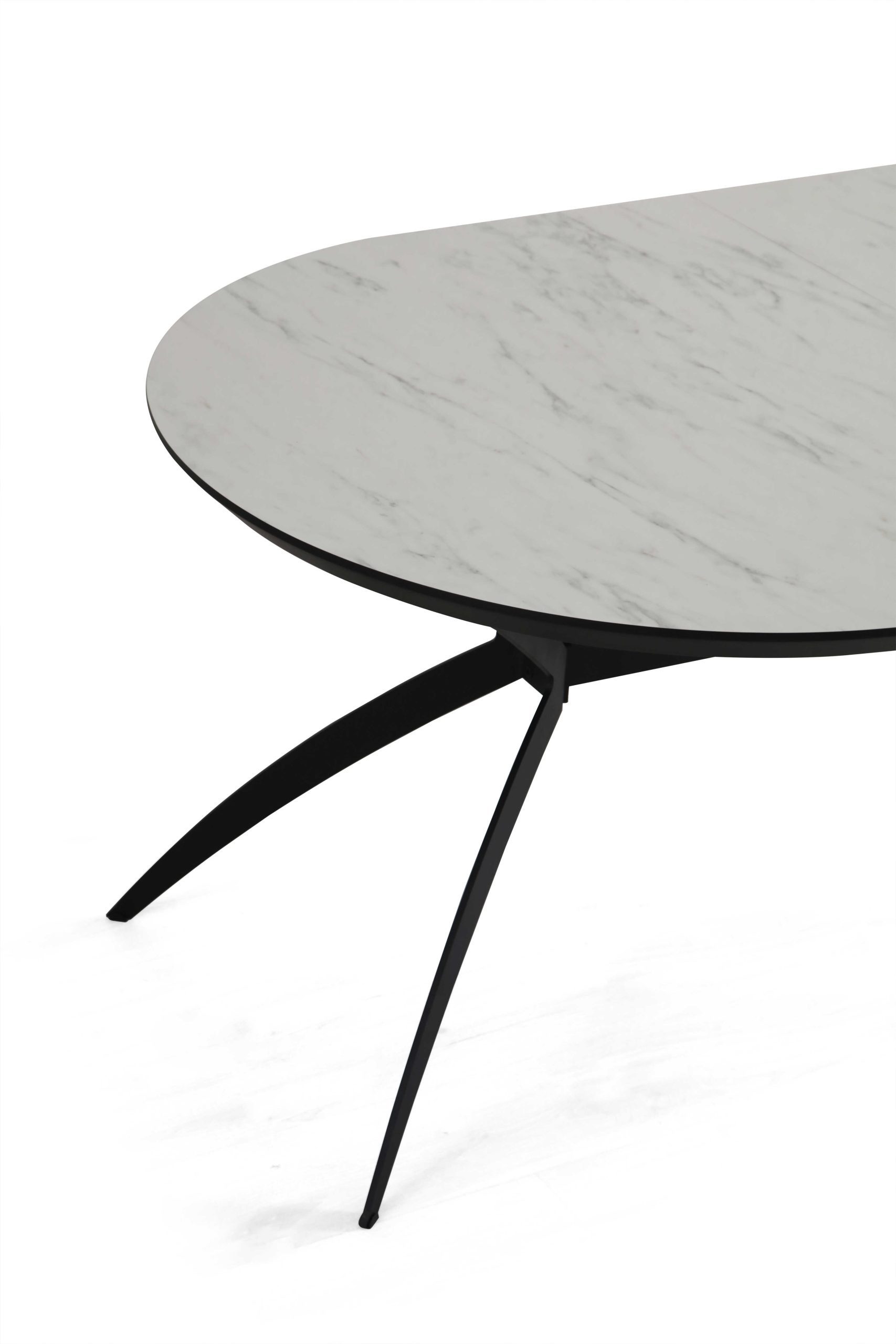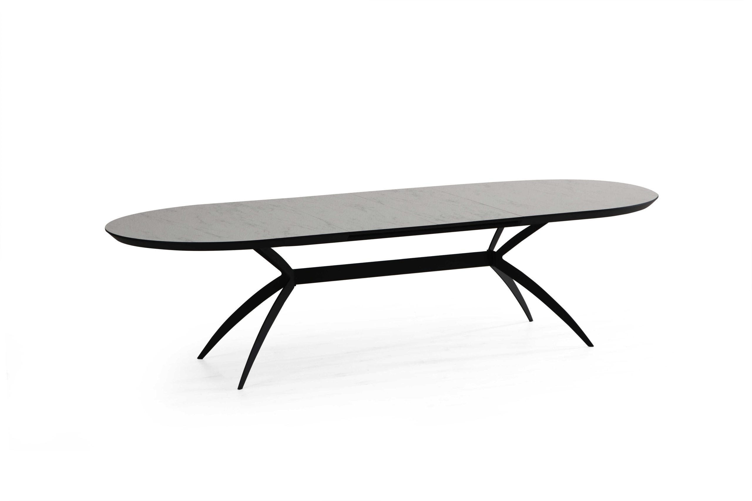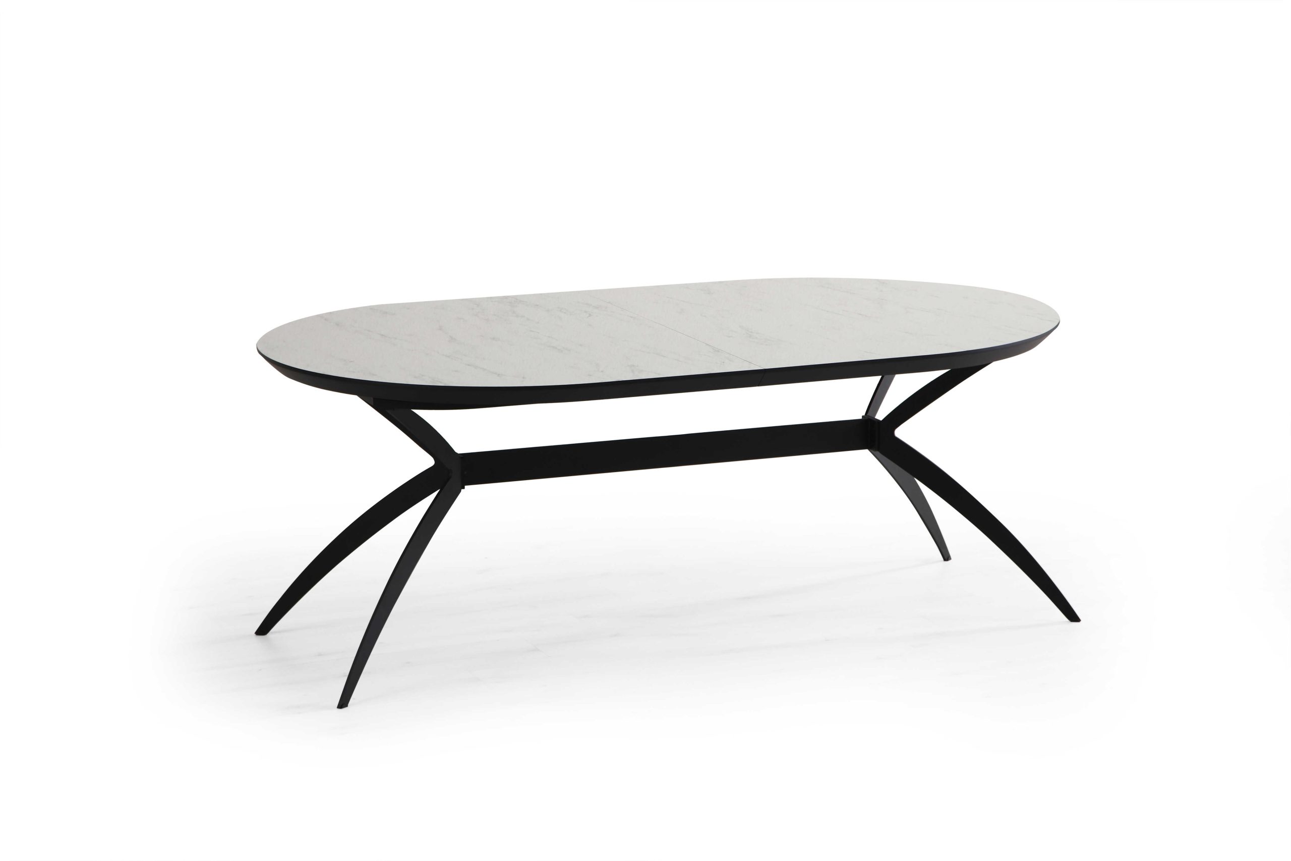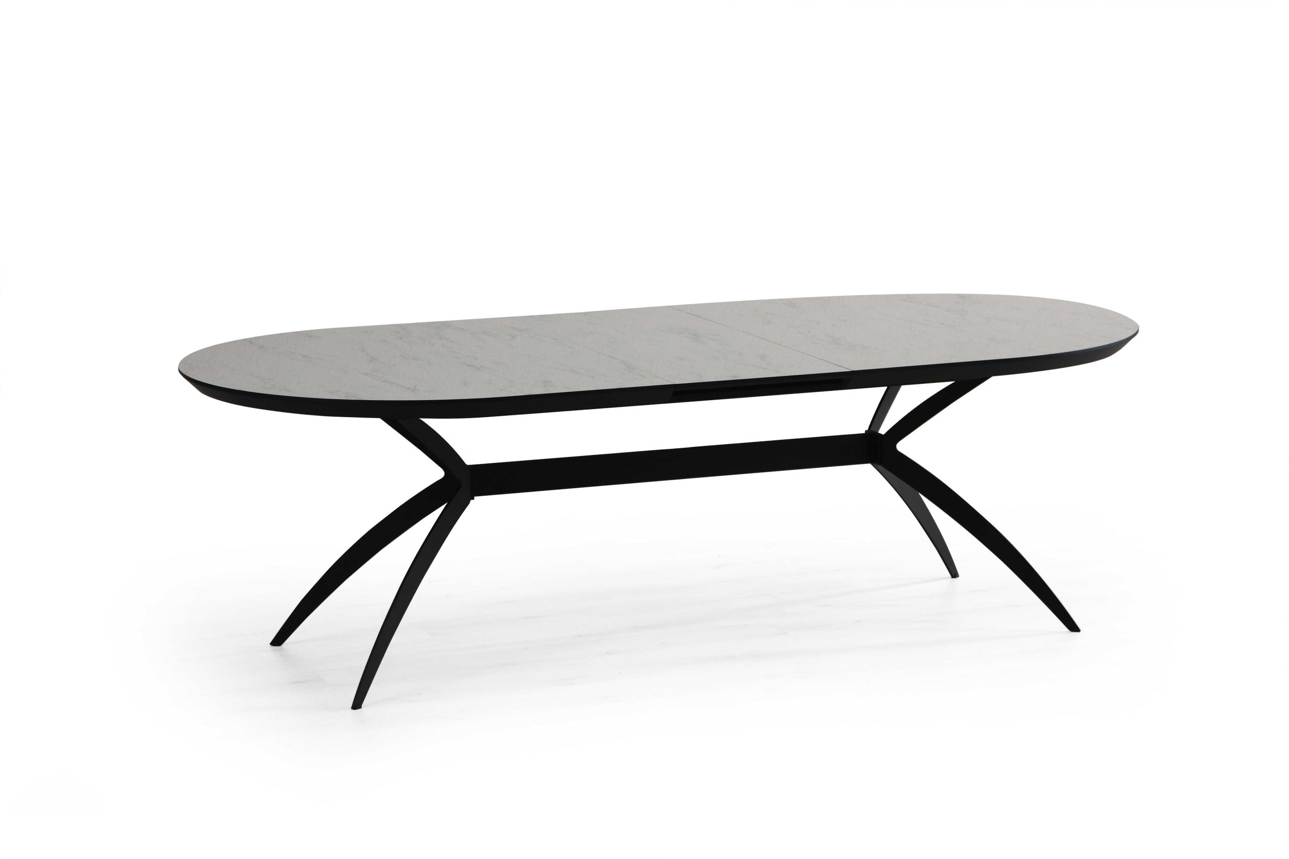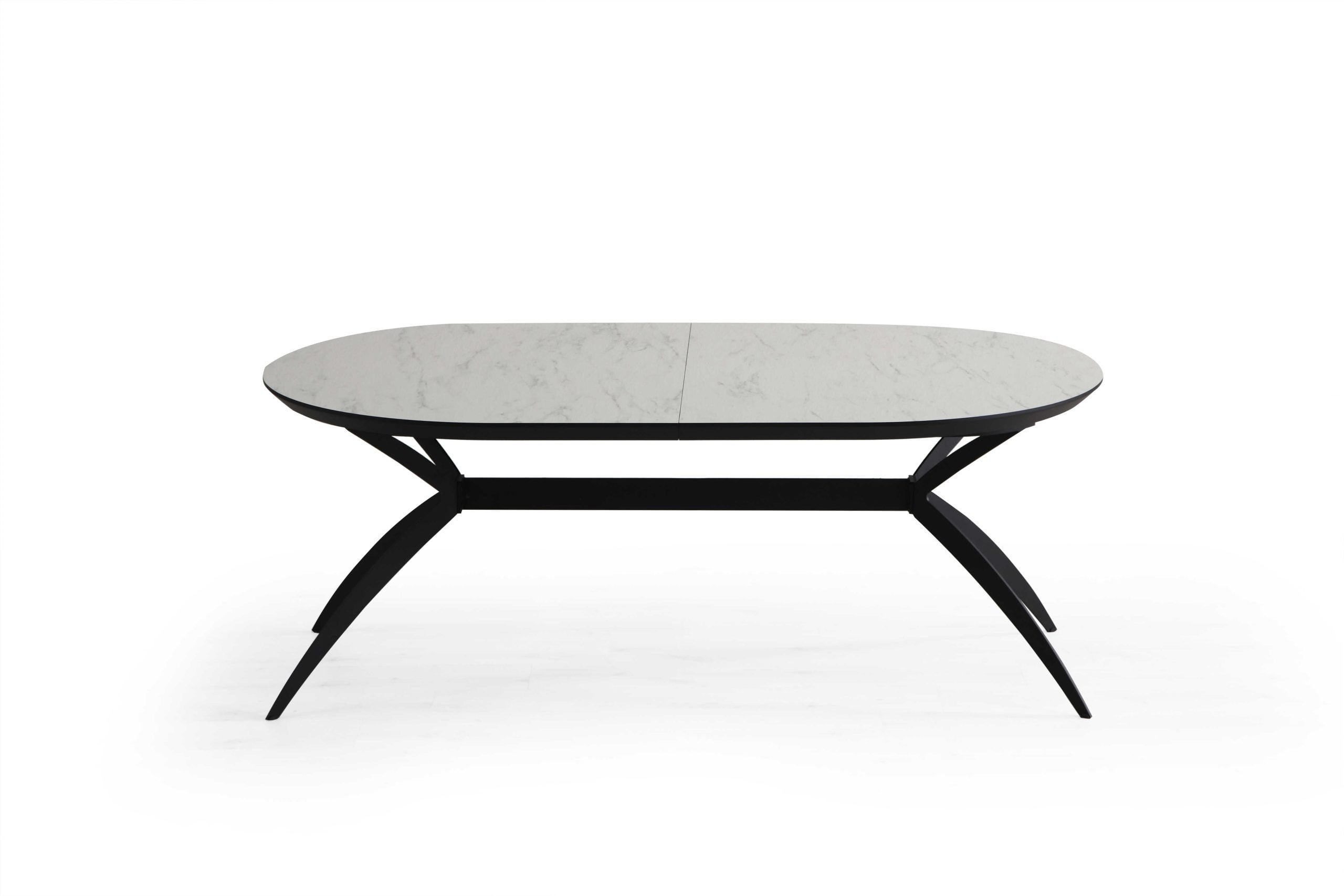 שולחן פינת אוכל אובלי ייחודי למראה דגם סורינו בגימור דמוי שיש לבן מבריק בעל צללית דופן נמוכה לאחסנת ההארכות הפנימיות עשיר וחם במראהו ומעוצב עד הפרטים הקטנים ביותר .