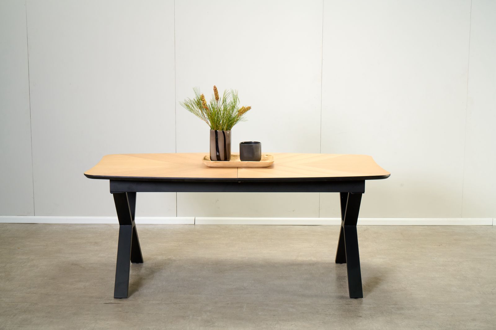 פינת האוכל בציפוי פורניר מדמוי עץ מלא, ורגלי השולחן עשויות מתכת עם שכבת פלסטיק המגינה על הרגליות למניעת שחיקה.