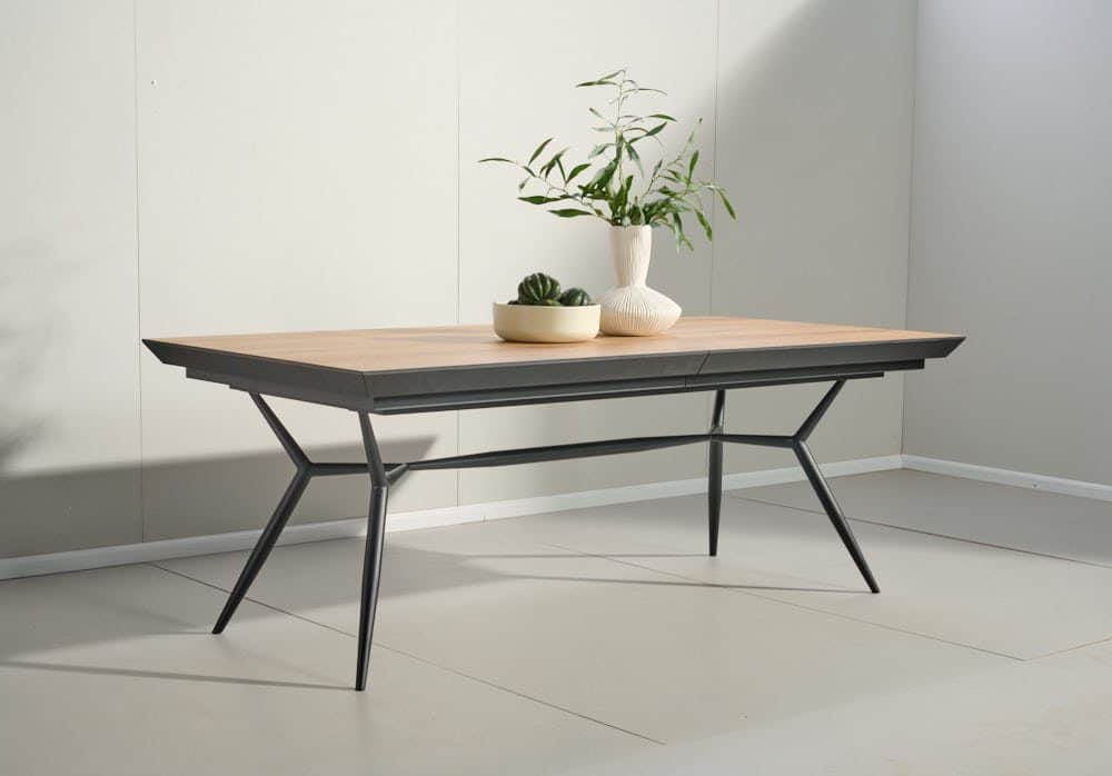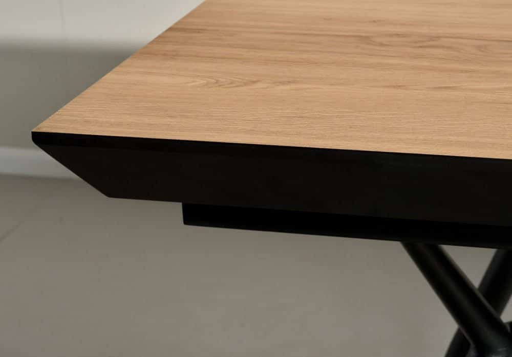 שולחן האוכל עשוי MDF בציפוי למינציה דמוי עץ טבעי , ורגלי השולחן עשויים ממתכת עם גימור צביעה אלקטרוסטטי נגד חלודה בצבע שחור.