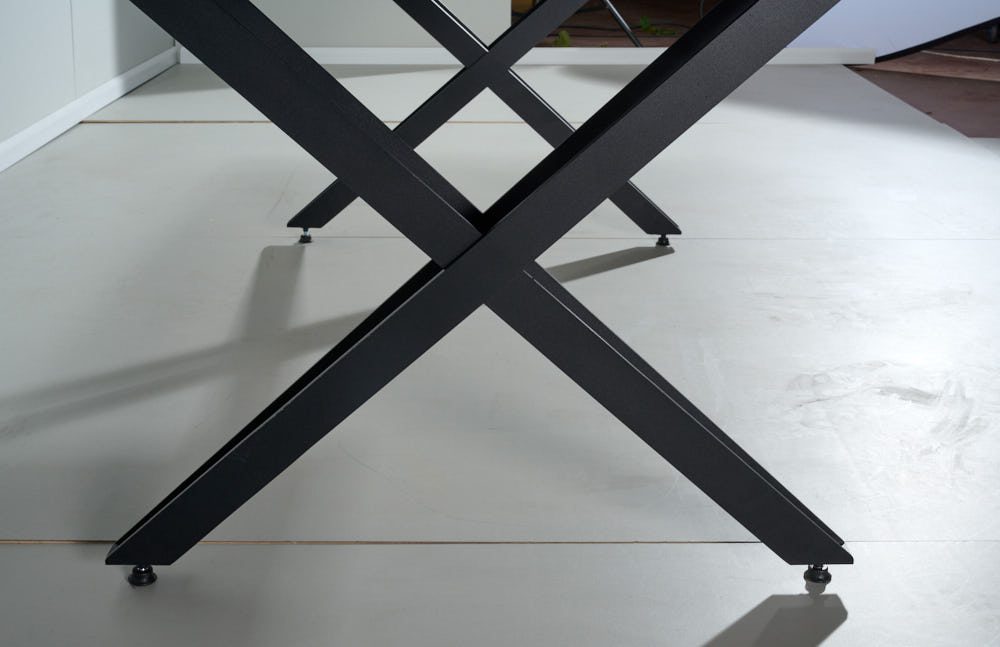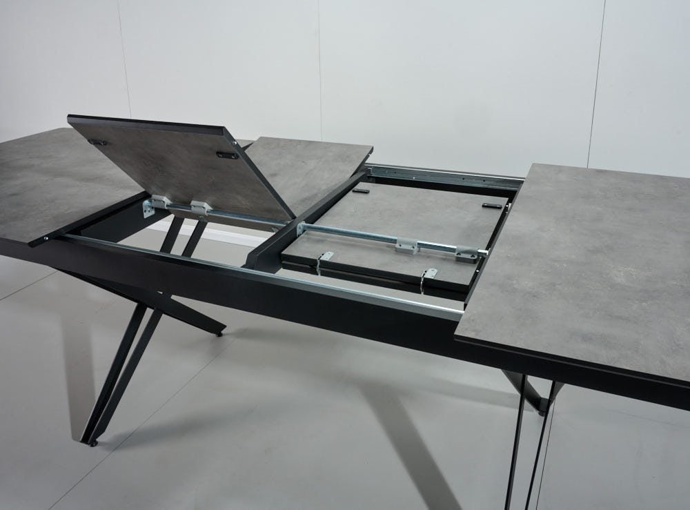 שולחן האוכל עשוי MDF בציפוי למינציה דמוי בטון , ורגלי השולחן עשויים ממתכת עם גימור צביעה אלקטרוסטטי נגד חלודה בצבע שחור.