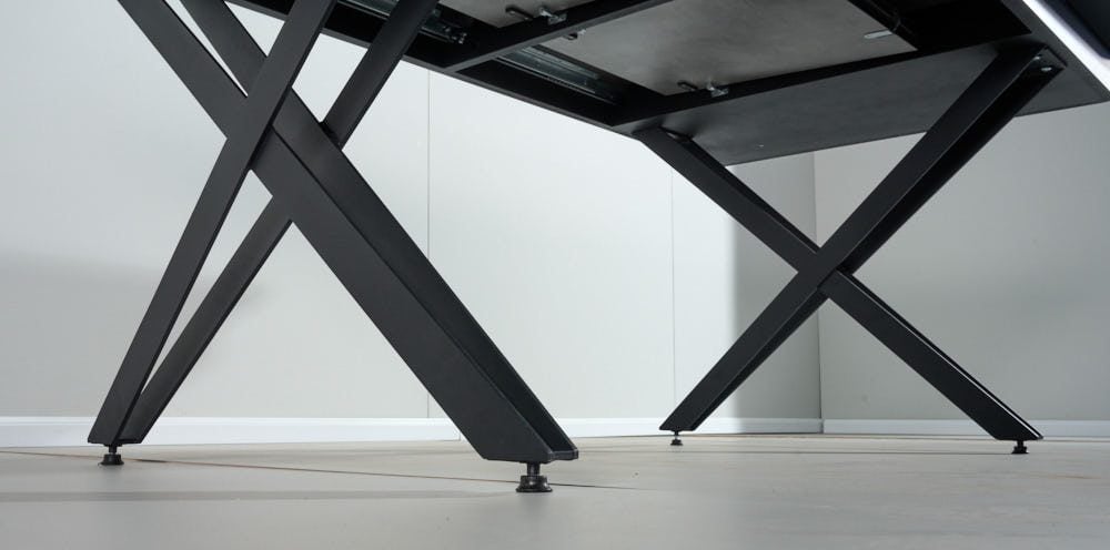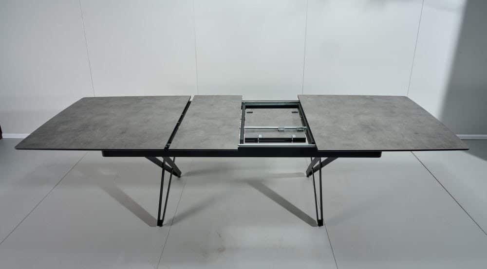 השולחן באורך 2.08 מ’ ובעל 2 הארכות של 45 ס”מ נוספים ואורך מלא של 2.98 מ’.