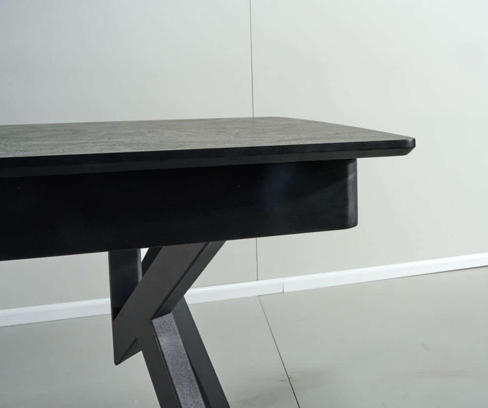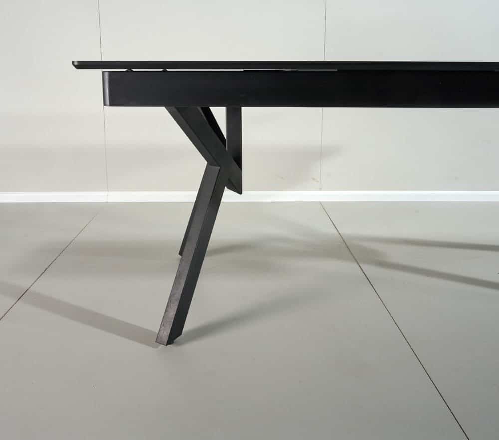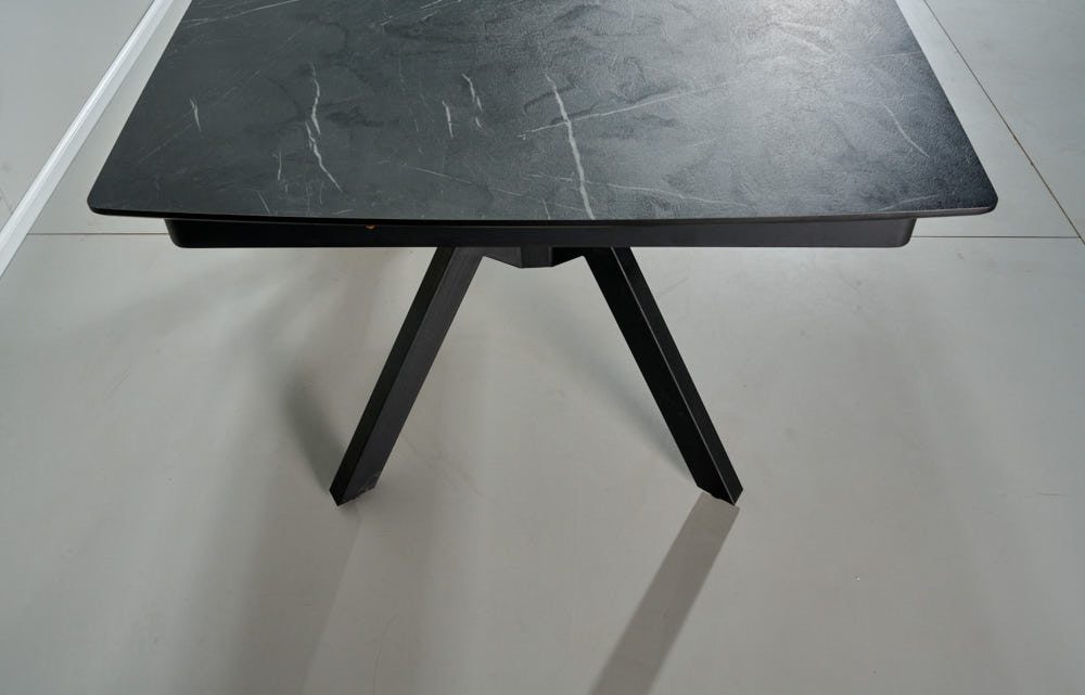 שולחן פינת אוכל מלבני דגם אייקון דמוי שיש שחור מט מעוצב עד הפרטים הקטנים ביותר.