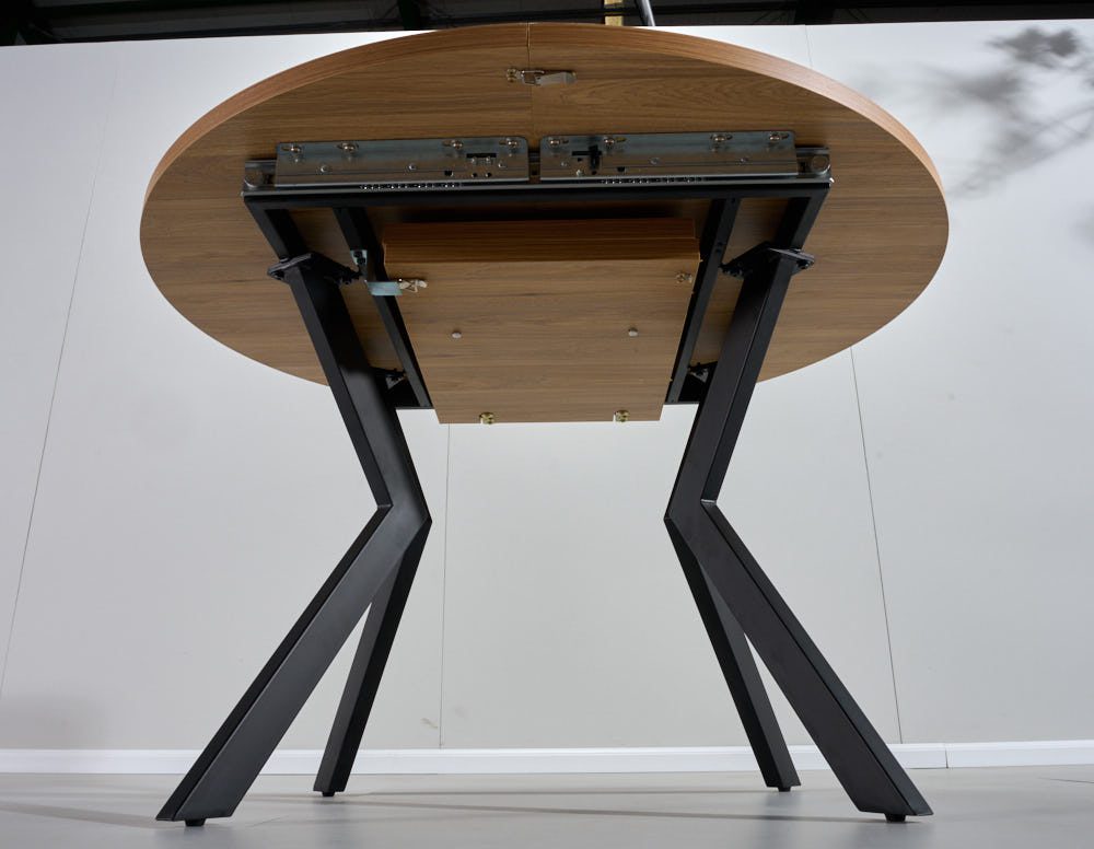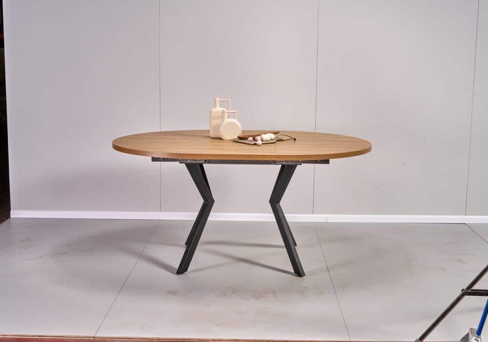 השולחן בקוטר 1.20 מ’ בעל הארכה של 40 ס”מ נוספים וקוטר מלא של 1.60 מ’.