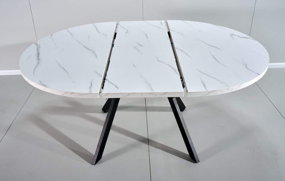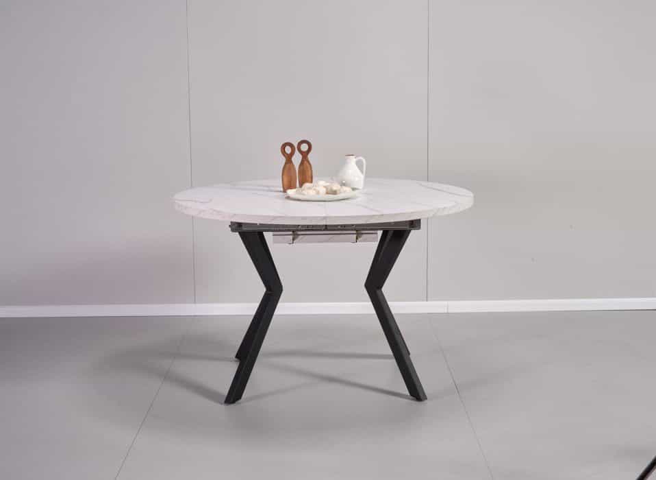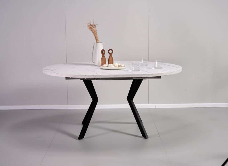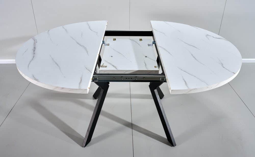 שולחן אוכל עגול נפתח דמוי שיש לבן דגם אלמוס – 8 סועדים