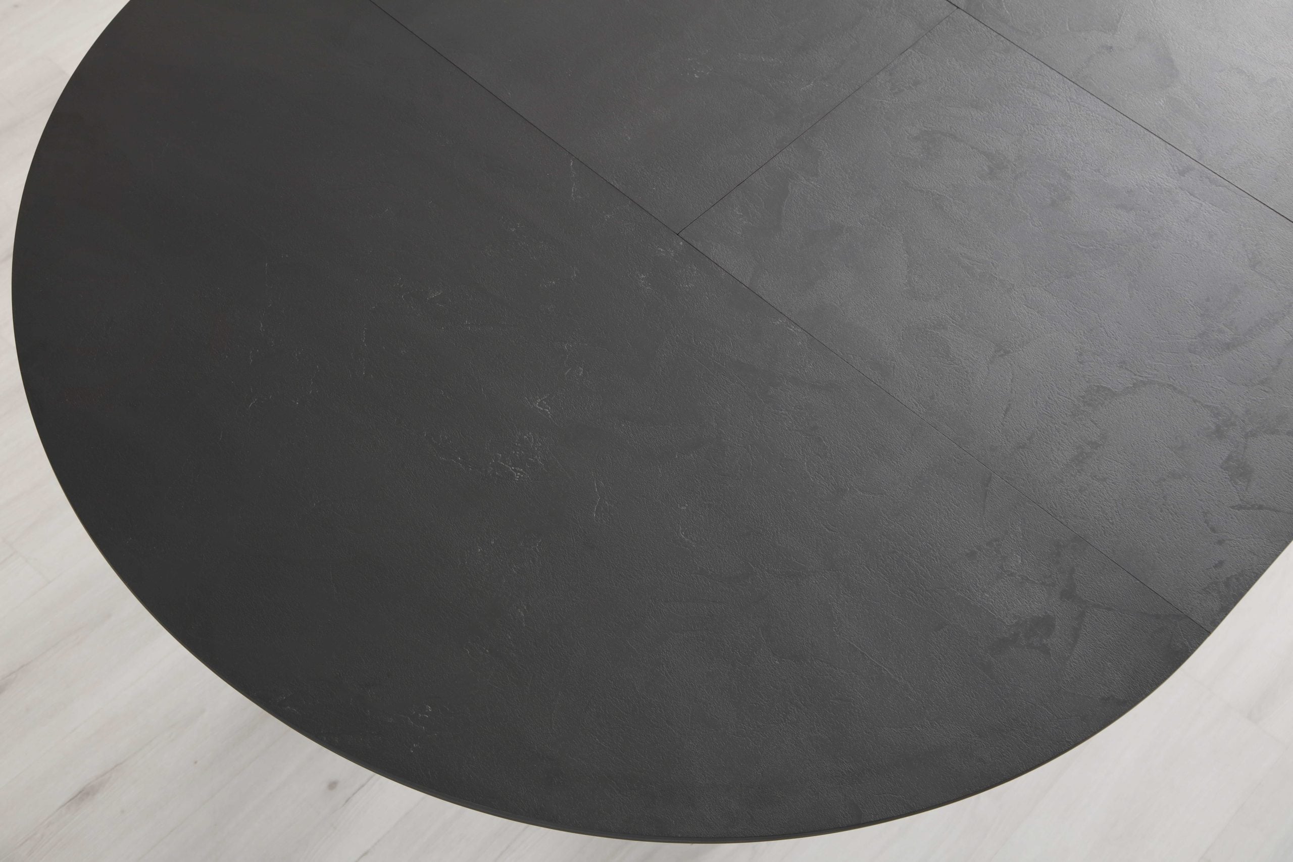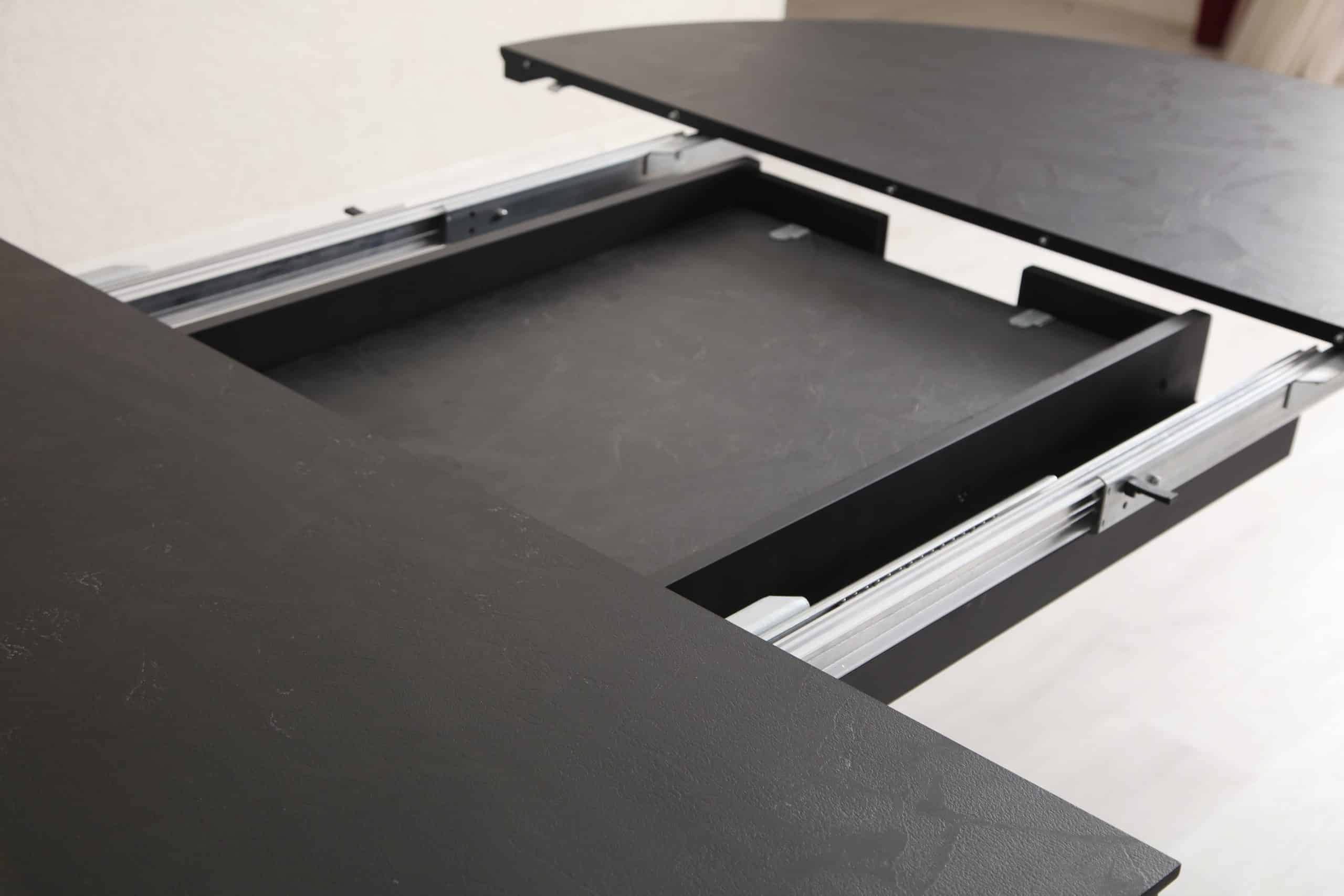 שולחן פינת אוכל נפתח דגם לונגו דמוי בטון שחור מעוצב עד הפרטים הקטנים ביותר.