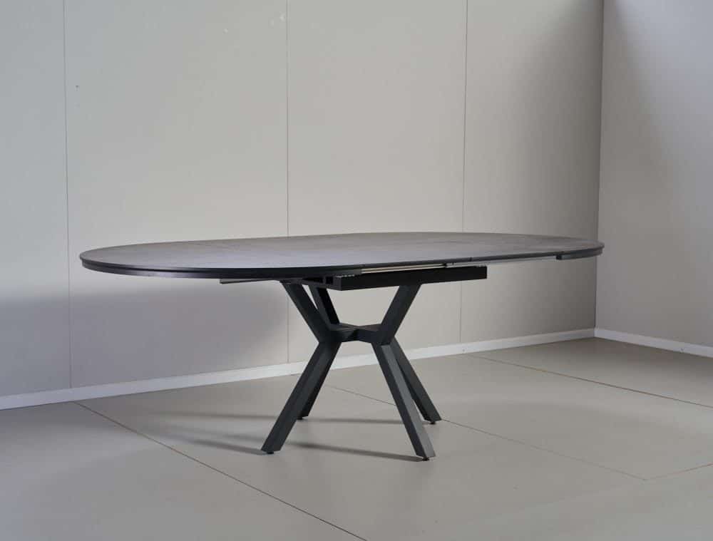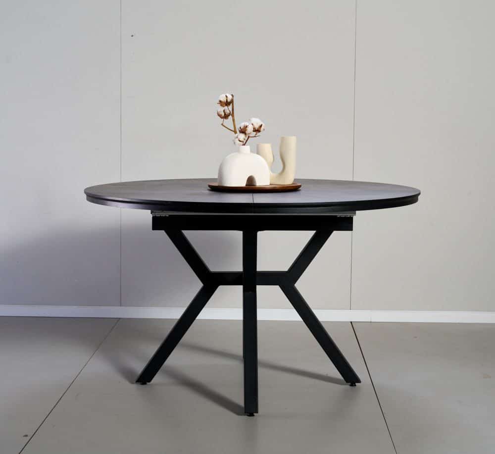 השולחן בקוטר 1.30 מ’ בעל 2 הארכות של 50 ס”מ נוספים וקוטר מלא של 2.36 מ’.